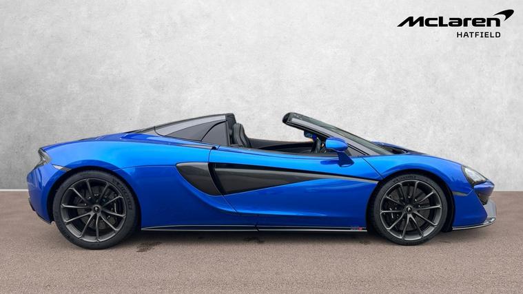 Fantastic example of a 570S Spider looking great in Vega Blue and sounds Great with the MSO Supersports exhaust fitted. Major service completed on arrival, including 4 new Mitchelin PS4 tyres. Vega Blue elite paint with Dark Palladium Roof, front and rear splitter. MSO SuperSport Exhaust, with Stealth finisher, Front Splitter, 10-Spoke Lightweight Wheel - Stealth, , Ceramic Brakes with Black Callipers, Tyre Pressure Monitoring System, Soft Close Doors. Interior Trim - Nappa Sport, Interior Theme - Jet Black, Luxury Pack with Electric and Heated Memory Seats, almond white stitching Electric Steering Column, Carbon Fibre interior pack with Carbon fibre/leather steering wheel, paddle clasp and infotainment surround. Almond White Stitching. Bowers and Wilkins 12 Speaker Audio System, Parking Sensors (Front and Rear), Parking Sensors and Rear Parking Camera, Security Pack, Volumetric Alarm, Vehicle Tracking System, Nose Lift. Major service completed at McLaren Hatfield on arrival, and 4 new Mitchelin PS4 fitted. 12 month McLaren Qualified Warranty. Front End PPF.