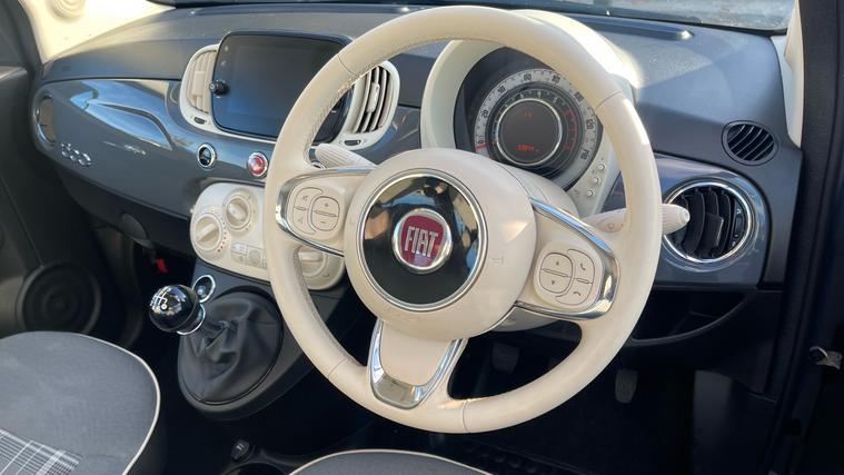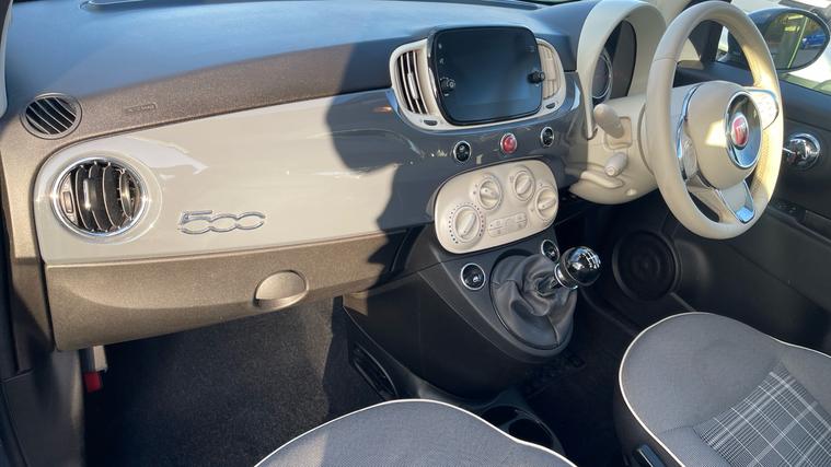 The Fiat 500 has been reinvented with an intelligent Mild-Hybrid Engine and new standard equipment to keep you relaxed whilst behind the wheel. This our Fiat 500 model is the excellent 'Lounge' trim that includes a Fixed Glass Roof, and Rear Parking Sensors as standard. The UConnect multifunction display screen is provided as standard and includes AM/FM and DAB radio bands with Bluetooth, USB and AUX media connections. Air Conditioning is also included on this car, and controlled through the buttons located below this display. Heading into the boot and the 500 includes an impressive 185 litres of cargo space as standard. Lowering the 50:50 split rear seats will allow you to carry larger loads when required.