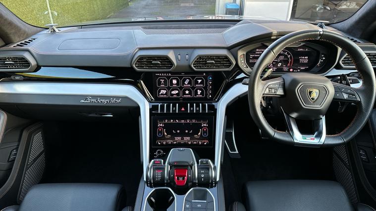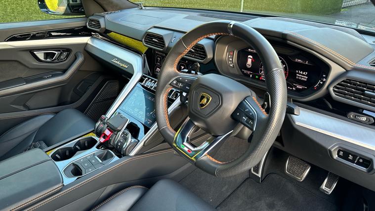 Lamborghini Urus 4.0 V8 finished in Grigio Keres Grey with Arancio Leonis Orange contrast high specification . Lamborghini Urus 4.0 V8 high specification including Taigete 23 diamond finished alloy wheels Panoramic glass Roof BangOlufsen Sound System and Park Assistance Package with Remote ParkAssist.