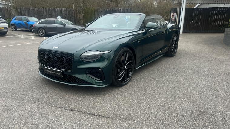 A stunning Viridian Green GTC Speed First Edition available now. Striking GTC Speed First edition in Viridian Green with a beluga black interior and camel accents and a veneer in dark tint engine turned aluminium. Fantastic specification, touring specification , continental gt blackline specification, front seat comfort specification, Bentley rotating display, Naim audio, leather specification, mood lighting, front end ppf and animated welcome lamps.