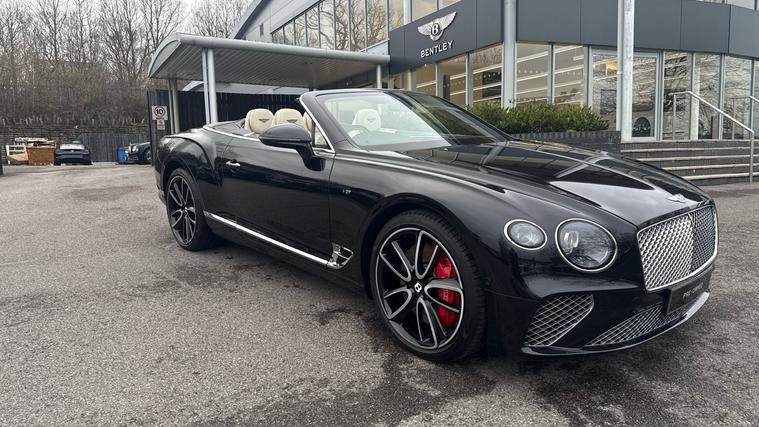 Bentley Continental 4.0 V8 GTC finished in Onyx Black with a Linen Interior. Mulliner Driving Specification with Black and Polished Edge Wheel, Diamond Quilted Hide Seats, Keyless Entry, DVD Player, Blind Spot Assist and Exit Warning, Upper Decorative Inserts - Piano Black, Electrically Operated Door Mirrors with Heating.
