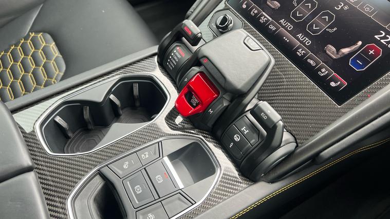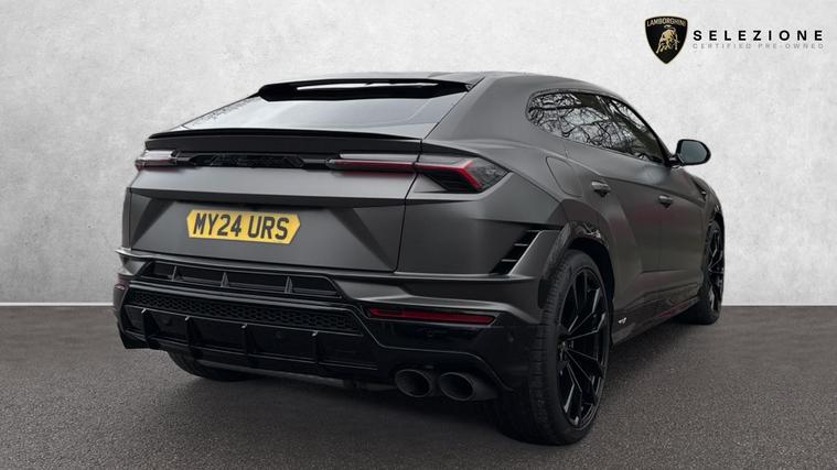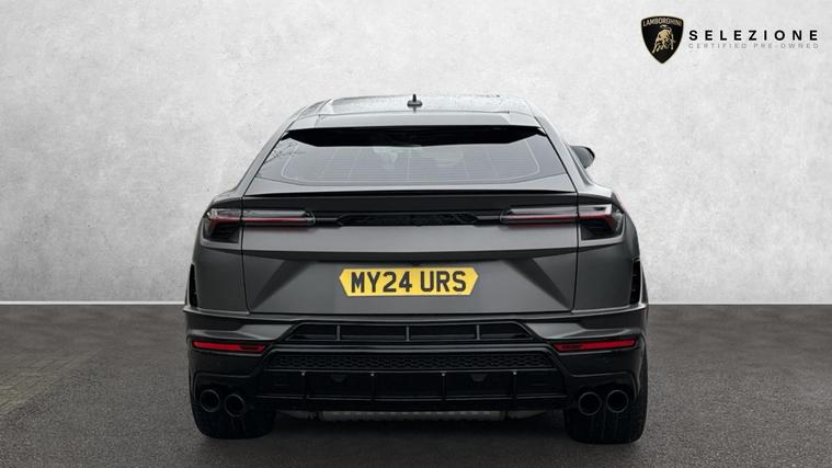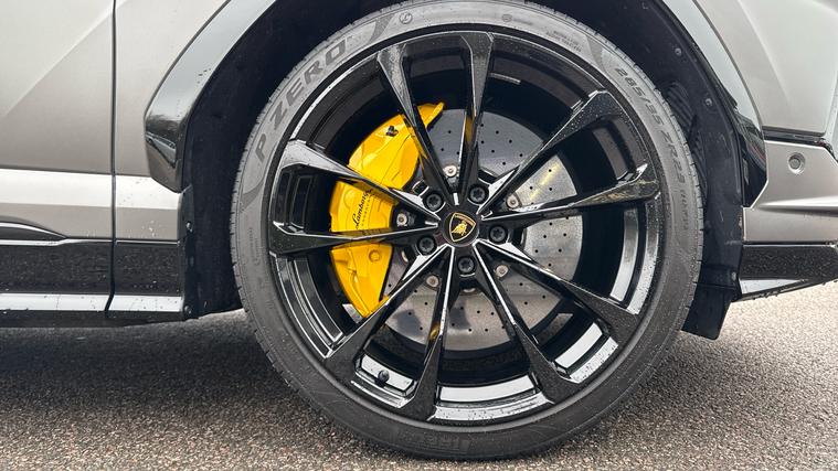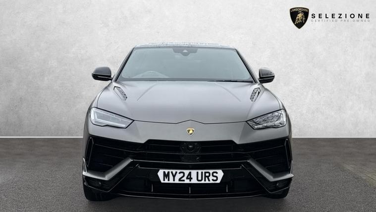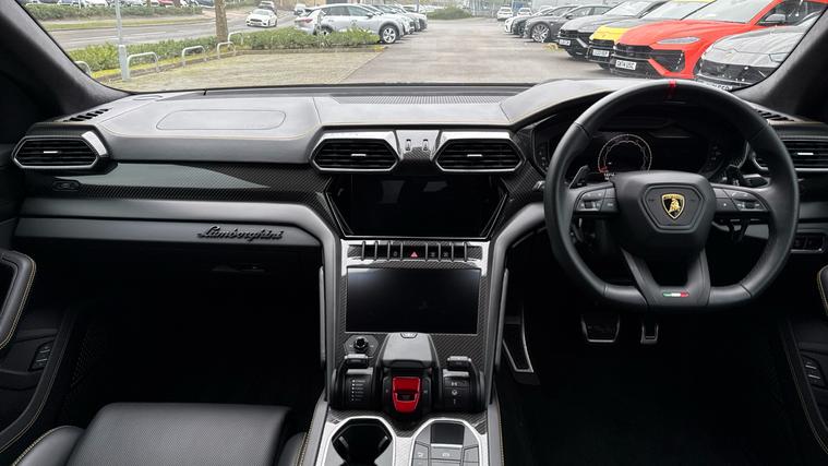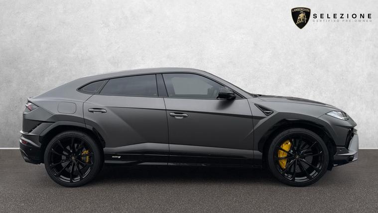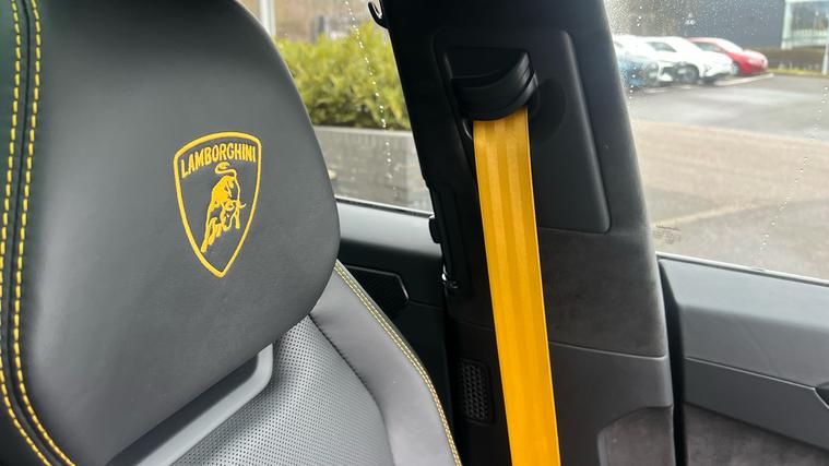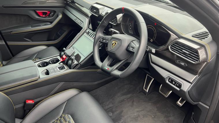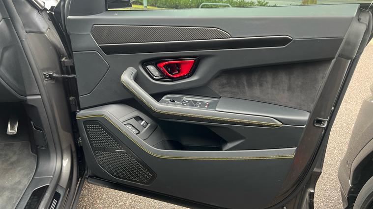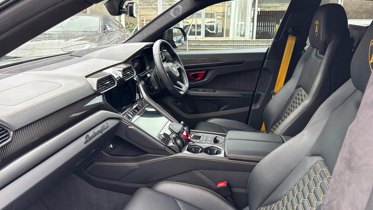 This one owner Urus 4.0 V8 S is finished in Grigio Keres with a Nero Ade interior with Yellow Stitching and Yellow callipers. Big Interior Carbon Package - Shiny, Interior Dark Package, Advanced 3D BangOlufsen Sound System, Q-Citura on Leather, Panoramic Roof, Sport steering wheel Full Leather with Dark chrome Bezel and Red Marker, heated, Rims Taigete 23 Shiny Black, Black Matt Exhaust Tailpipes, Style Package in High Gloss Black with front splitter, Front and Rear Seat Heating, Full Electric Front Seats with ventilation and massage, Park Assistance Package with Remote ParkAssist.