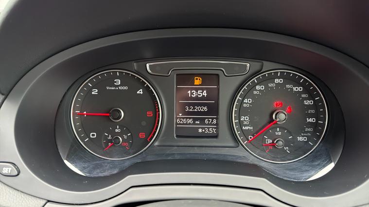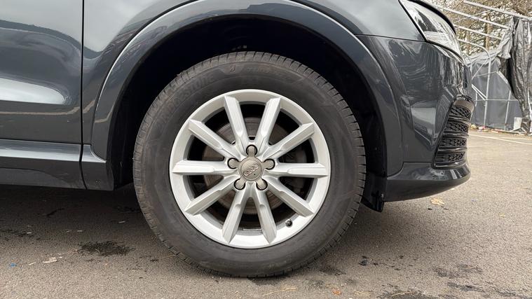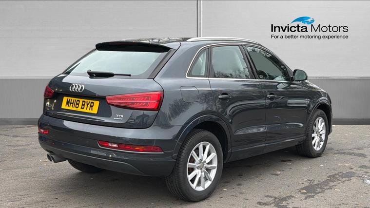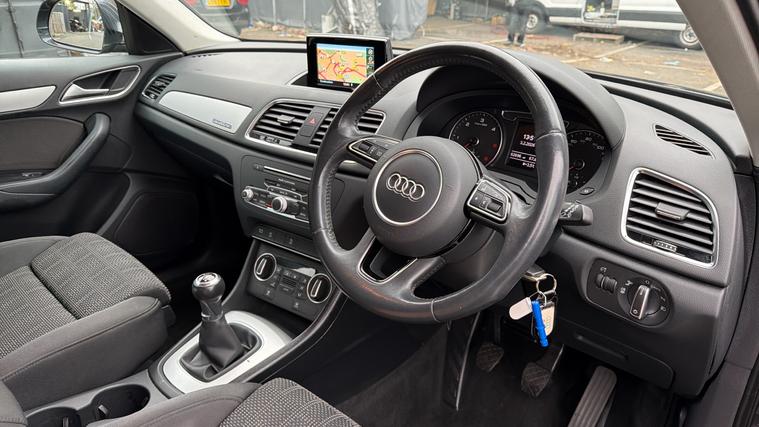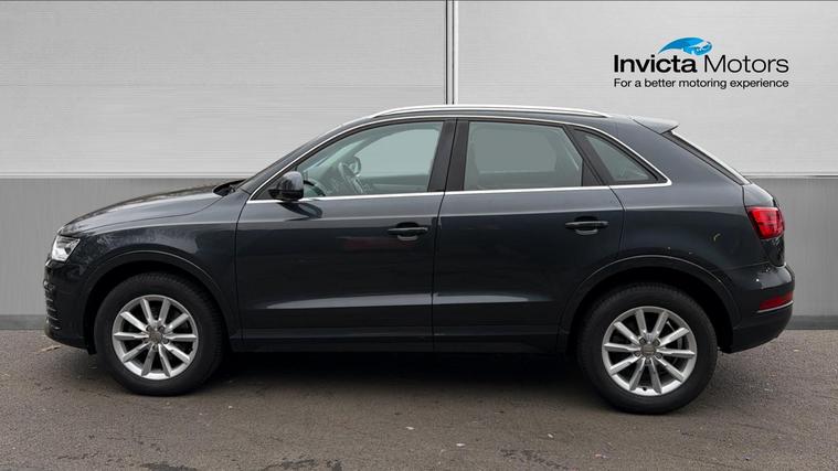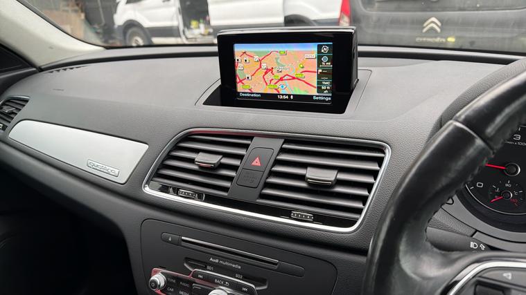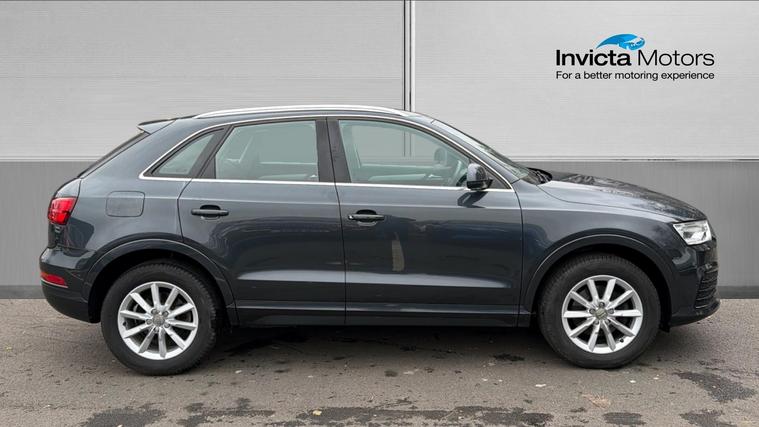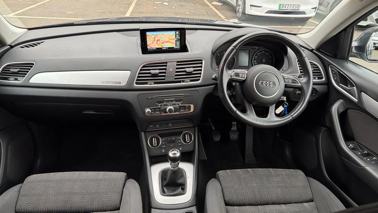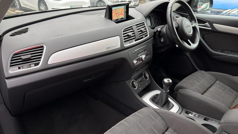 Our Q3 is an excellently equipped example, and includes Rear Parking Sensors, Bi-Xenon Headlights with Dusk and Rain Sensors, Cruise Control and even Dual Zone Climate Control. The Audi Q3 is a direct rival for the BMW X1 and Mercedes GLA, with its compact SUV design. Our 'Sport' model really stands out in the distinctive Metallic Grey paint which is accompanied by 17-inch Alloys and an abundance of Chrome Styling Ques. The cabin is trimmed with a beautiful 'Sport Cloth' upholstery in Black. The rear bench includes Isofix Points for younger passengers, which can be lowered to expand the 420 litre boot. The 'MMI' display sits on top of the dashboard with connections included for Bluetooth and USB enabled devices, with DAB radio bands too.