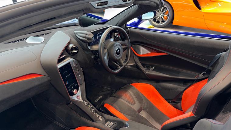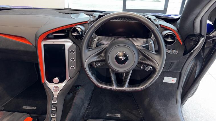 This Stunning colour paired with a huge specification of carbon fibre. Finished in stunning Elite Tanzanite Blue, this 750S Spider features an extensive Carbon Fibre exterior specification including Visual Carbon Fibre Rear Bumper, Carbon Fibre Tonneau, Front Fenders and Louvres, Hood Air Intakes, Door Mirrors, B-Pillars, Rear Air Intakes and Gloss Carbon Fibre exterior detailing. Gloss Black Roof, Rear Aero Bridge and Front Splitter complement the aggressive design, alongside Stealth Exhaust Finishers and Sports Exhaust.Optioned with the Carbon Fibre Exterior Details Pack and Upper Structure Carbon Fibre Pack, this example sits on Silver Strike 10 Spoke Super-Lightweight Wheels with Red Calipers, Front and Rear Parking Sensors with Rear Camera, 360 Park Assist, Vehicle Lift, Sound Comfort Windscreen and full security package including Tracking System and Volumetric Alarm complete the exterior specification.Inside, the Performance Interior in Carbon Black with Ember Orange provides a purposeful yet luxurious cabin. Comfort Seats with electric adjustment, heating and memory are paired with Carbon Fibre Interior Pack, Carbon Fibre Steering Wheel with Leather Grips, Carbon Fibre Paddles and Clasp, and Bowers + Wilkins 12-Speaker Audio.A highly specified, beautifully configured 750S Spider combining serious performance with standout visual presence.