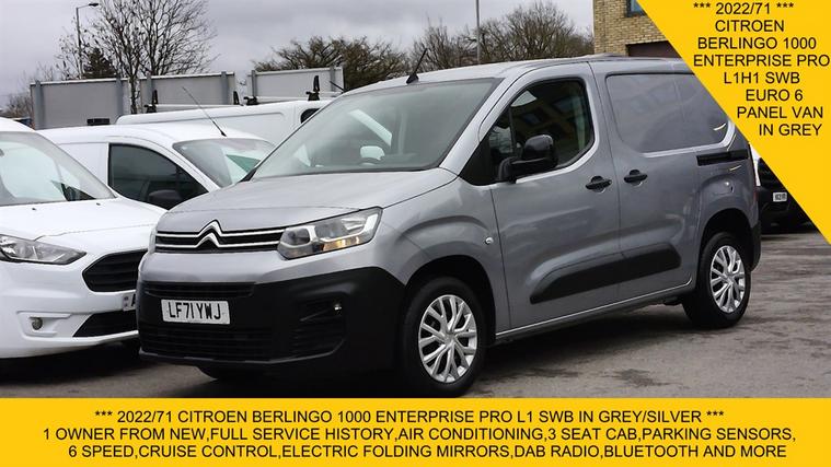 *** CHOICE OF 2 FROM 8795+VAT *** 2022/71 CITROEN BERLINGO 1000 ENTERPRISE PRO L1 SWB IN GREY/SILVER 71.000 MILES AND 79.000 MILES, FULL SERVICE HISTORY, 1 OWNER FROM NEW, EURO 6 ULEZ COMPLIANT, 3 SEAT CAB, AIR CONDITIONING, PARKING SENSORS, CRUISE CONTROL, TOUCH SCREEN DAB RADIO, ELECTRIC WINDOWS, ELECTRIC FOLDING MIRRORS, 6 SPEED MANUAL, SIDE LOADING DOOR, PLY LINED, AIRBAG, REMOTE CENTRAL LOCKING, BLUETOOTH PHONE CONNECTION, GREAT FIXED RATE FLEXIBLE FINANCE AVAILABLE, DEBIT/CREDIT CARDS ACCEPTED.