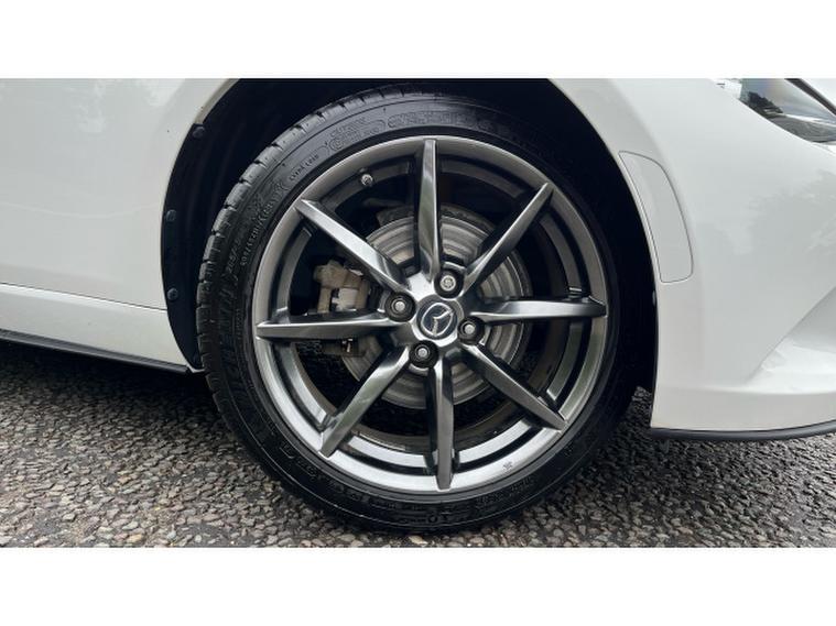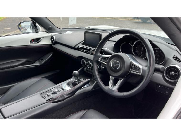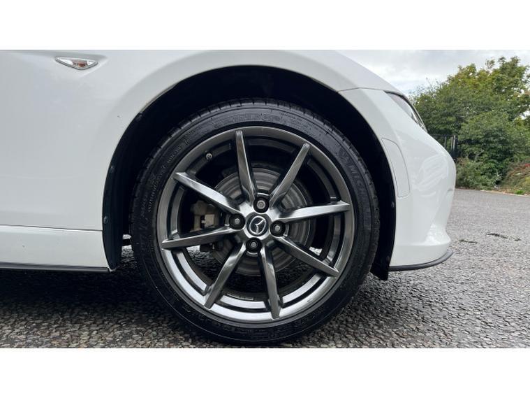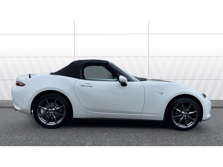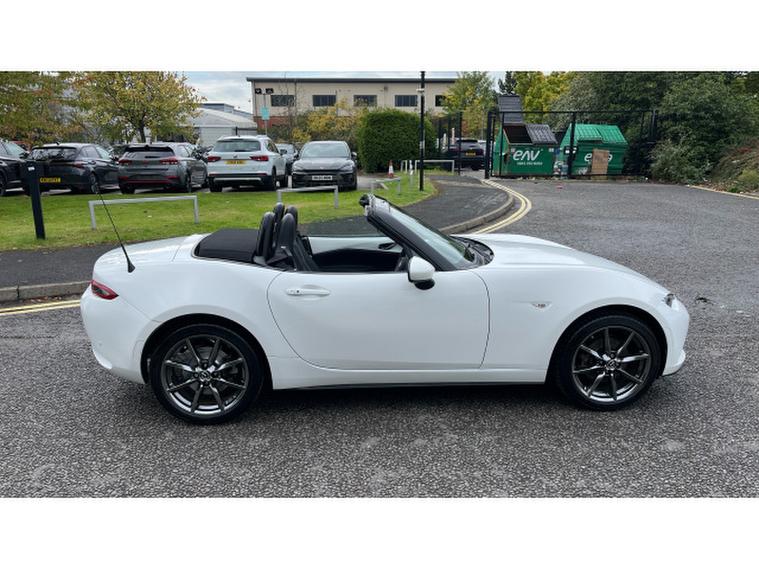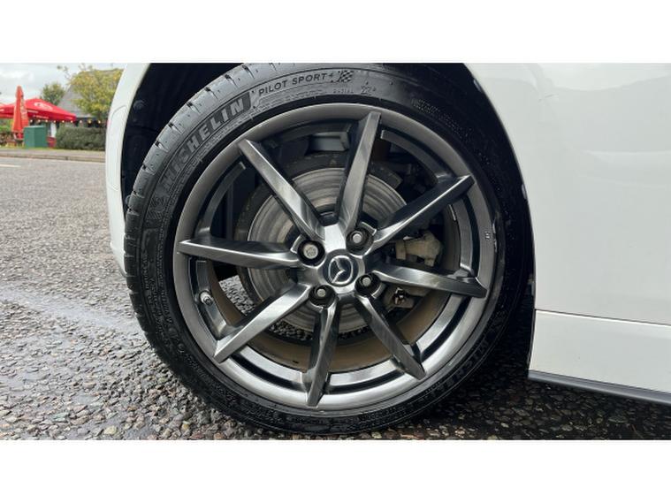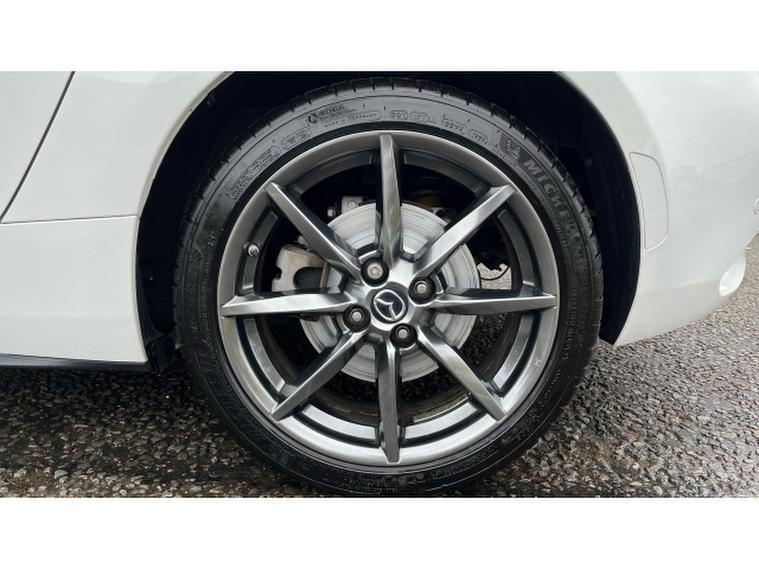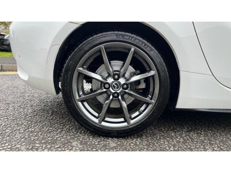 The Crystal White paintwork accentuates the MX-5s timeless silhouette, contrasting beautifully with its bold alloys and sharp styling lines. This is a car that turns heads roof up or down.