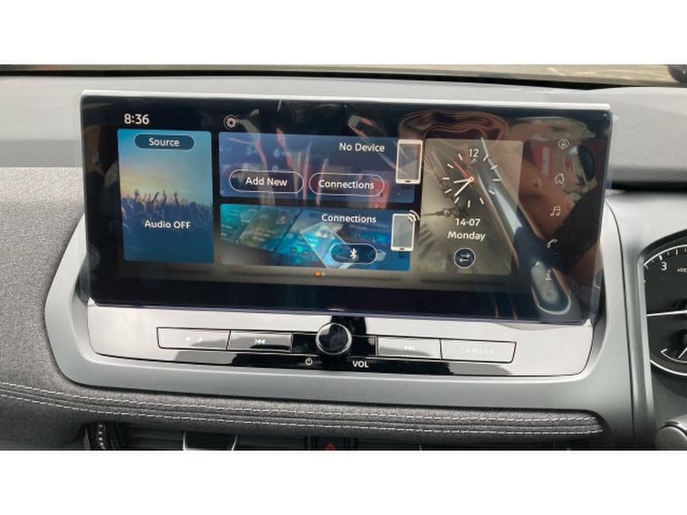 Inside, the cabin is both spacious and refined, featuring a 12.3-inch NissanConnect touchscreen infotainment system that integrates seamlessly with Apple CarPlay and Android Auto. Dual-zone climate control, a rear-view camera, and a leather-wrapped steering wheel further elevate the driving experience, ensuring comfort and convenience for all occupants. The Acenta Premium trim also includes 17-inch alloy wheels and a panoramic glass roof, adding a touch of elegance to the vehicle's exterior.