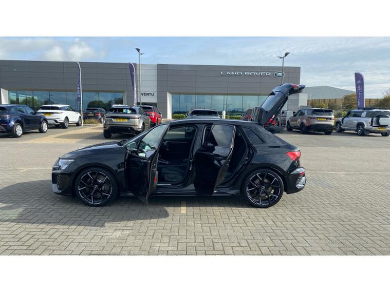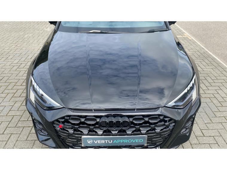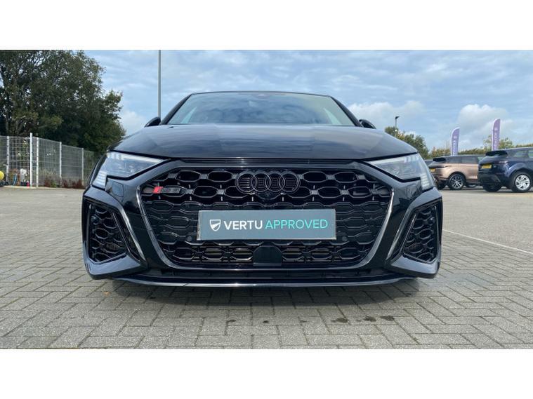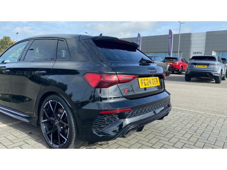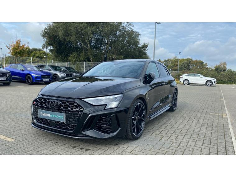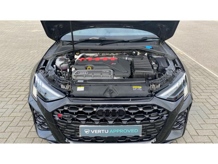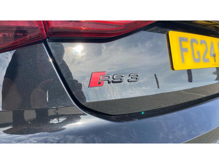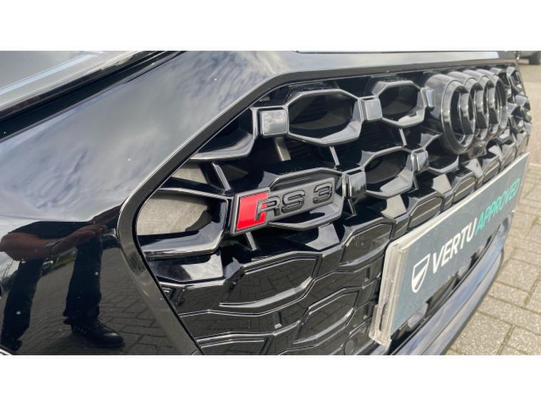 Audi RS3 RS 3 TFSI Quattro Vorsprung 5dr S Tronic Petrol Hatchback, , Vertu JLR Truro are proud to offer this stunning Vertu Approved Used 2024 Audi RS 3 Sportback RS 3 TFSI Quattro Vorsprung 5dr S Tronic, finished in striking Mythos Black Metallic with Black RS Sport seats. Combining high-performance engineering with everyday usability, the RS 3 delivers exhilarating power, sharp handling, and quattro all-wheel-drive confidence. Powered by a 2.5-litre turbocharged TFSI engine paired with S Tronic automatic transmission, it offers thrilling performance while maintaining precision and control.