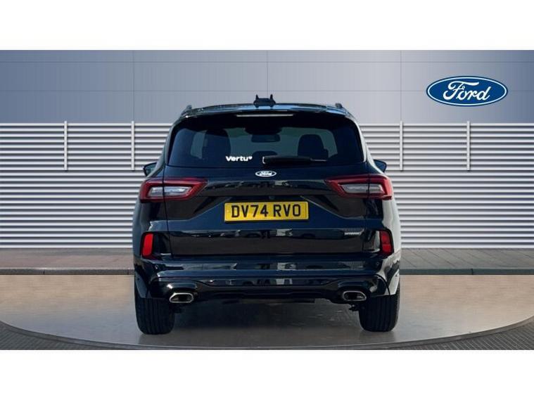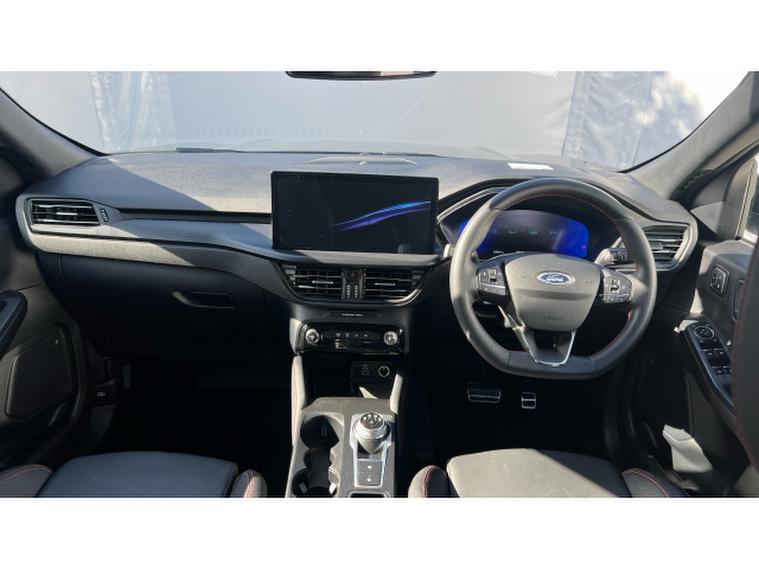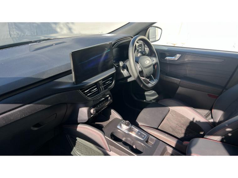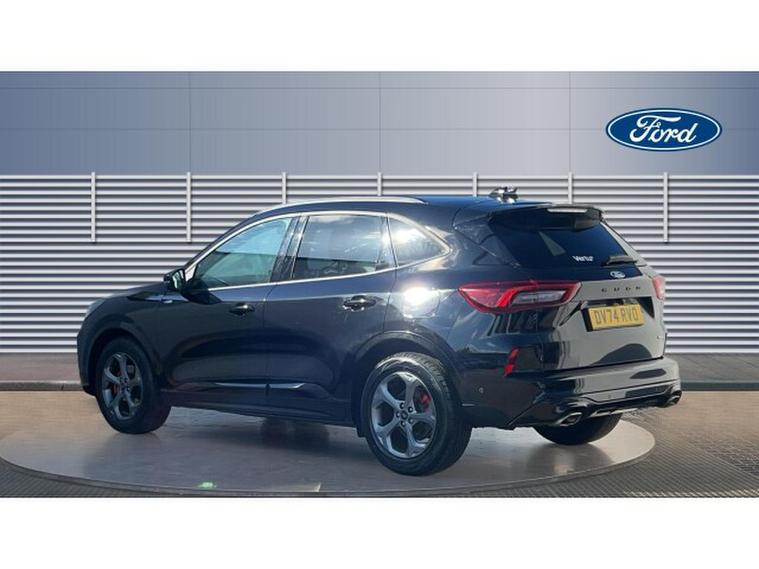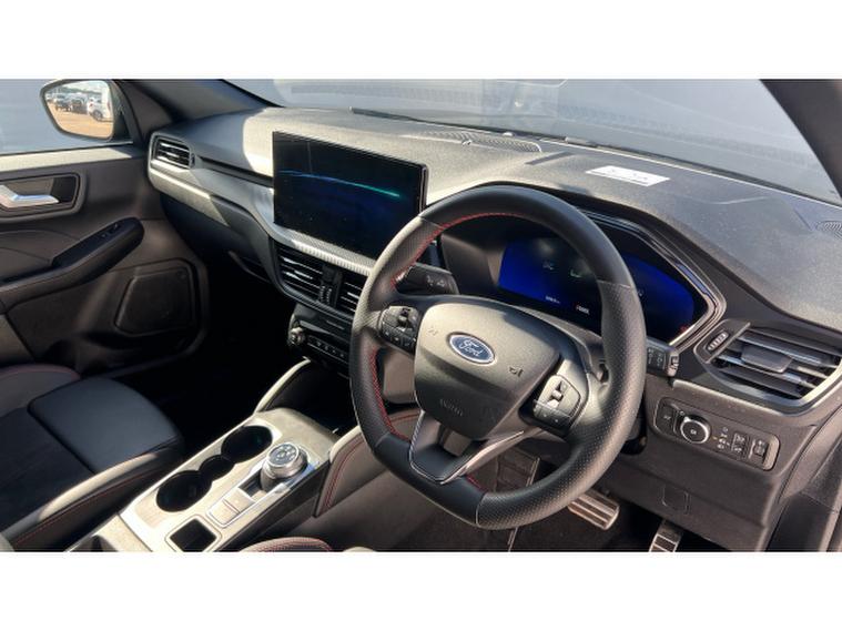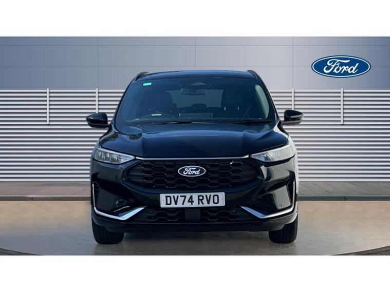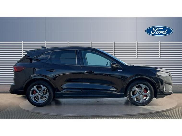 Ford Kuga 2.5 FHEV ST-Line 5dr CVT Hybrid Estate, , Gloucester Ford have this Ford Kuga 2.5 FHEV ST-Line finished in the metallic Agate Black. This Kuga 2.5 FHEV ST-Line CVT in Agate Black stands out immediately as a classy, capable and technologically advanced family car. Its sleek estate body gives you loads of space, while the hybrid powertrain cleverly blends performance with fuel economy in everyday use. Firstly, the 2.5-litre FHEV (Full Hybrid Electric Vehicle) setup is a real highlight: you get smooth, responsive acceleration from electric assist, seamless transitions, and significantly reduced fuel consumption for commuting and mixed driving. Its also quieter than many traditional petrol engines, especially in town, bringing refined comfort. The CVT gearbox complements that well, keeping the drive relaxed and stress-free, with no gear-hunting, just smooth pull through the rev-range. Styling is strong. Agate Black gives the Kuga a bold, premium presence, sophisticated yet tough-looking. The ST-Line trim adds sporty touches, sharper bumpers, sporty trim, alloy designs that look both athletic and upscale. The 18-inch alloys offer plenty of visual appeal without going overboard on ride harshness. In terms of tech and driver assistance, the offerings are very appealing. SYNC 4 adds an up-to-date infotainment system: responsive, intuitive, with good graphics, smartphone integration, and built-in navigation. Parking is made easy with front and rear sensors, while the rear-view camera gives great visibility behind the car, especially useful in tight spaces or reversing out of driveways or parking spots. Inside offers generous luggage room, and substantial cabin space with thoughtful ergonomics and comfort materials. Practical touches abound: storage cubbies, good trimming, and visibility is solid all around. On the road the Kuga rides well, with a firm-but-comfortable suspension, precise steering, and confident handling around corners, yet composed over bumps.