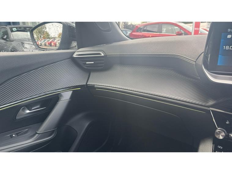 Inside, the cabin showcases Peugeots signature i-Cockpit layout with a compact steering wheel, 3D digital instrument cluster, and a large central touchscreen featuring Apple CarPlay and Android Auto. Premium materials, ambient lighting, and supportive sports-style seats create a modern and refined atmosphere.
