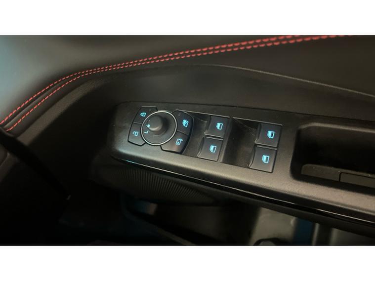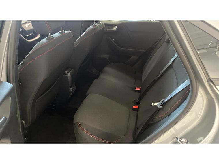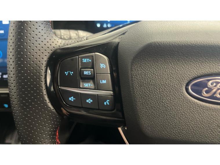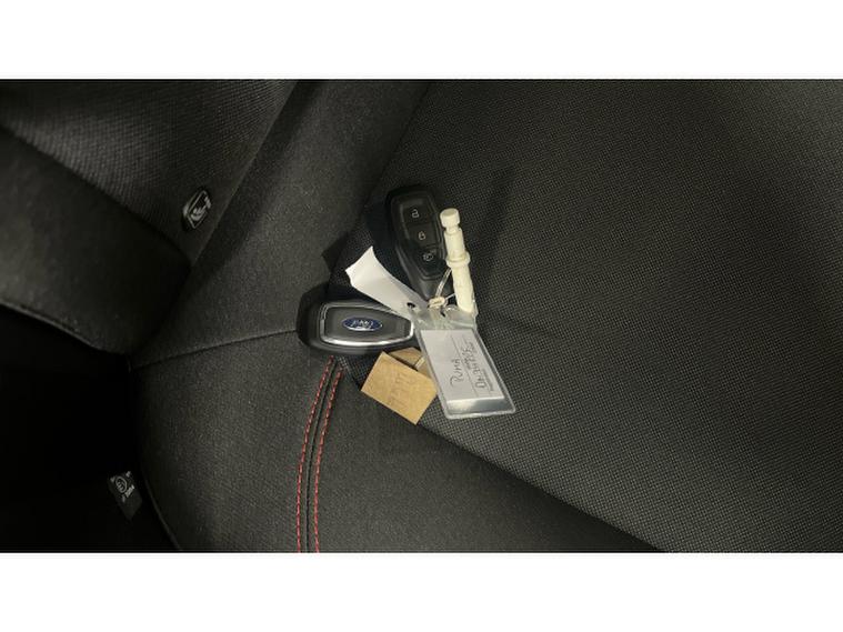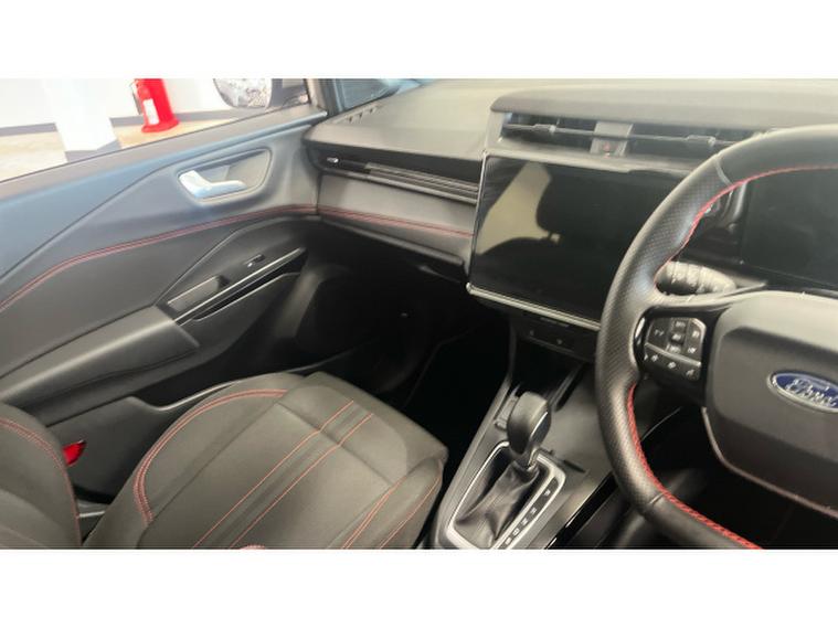 Inside, the ST-Line trim brings a sporty, premium feel with red contrast stitching, a flat-bottomed steering wheel, and sports seats. The cabin is packed with smart technology including a digital instrument cluster, SYNC 3 infotainment system with touchscreen display, Apple CarPlay/Android Auto, and advanced driver-assist features such as lane-keeping aid and cruise control.