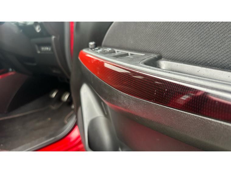 Inside, the cabin continues the sporty theme with red contrast stitching, semi-bucket sport seats, and a flat-bottomed steering wheel. The driver-focused layout includes a touchscreen infotainment system with Apple CarPlay and Android Auto, climate control, and a range of driver assistance features such as adaptive cruise control and lane departure warning.