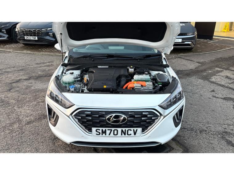 Hyundai IONIQ 1.6 GDi Hybrid Premium SE 5dr DCT Hybrid Hatchback, , This Hyundai Ioniq Hatchback 1.6 GDi Hybrid Premium SE DCT, finished in crisp Polar White and showing just under 13, 500 miles, combines advanced hybrid efficiency with refined comfort and smart technology. Powered by a 1.6-litre petrol engine paired with a smooth dual-clutch automatic transmission, it delivers excellent fuel economy, low emissions, and a quiet, composed drive — ideal for both urban commuting and longer journeys. The Premium SE trim offers an impressive level of specification, including a high-resolution touchscreen with navigation, Apple CarPlay and Android Auto, premium upholstery, heated front seats, dual-zone climate control, and a suite of advanced safety features for added confidence on the road. With its sleek design, efficient hybrid powertrain and well-equipped interior, this Ioniq Hybrid Premium SE presents a sophisticated and economical choice in the compact hatchback segment. A personalised video presentation is available on request.