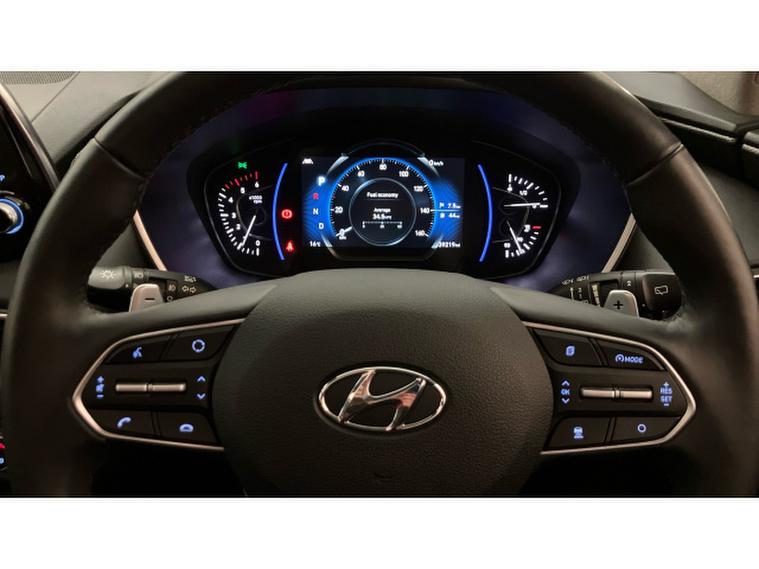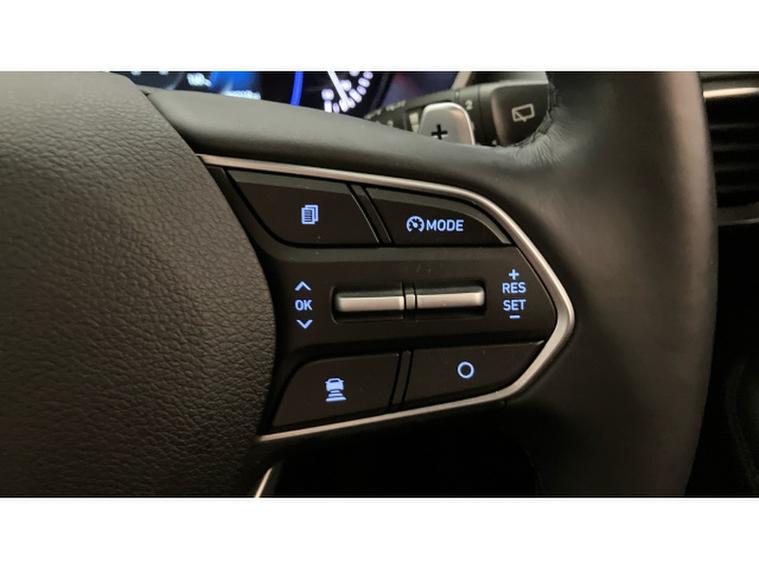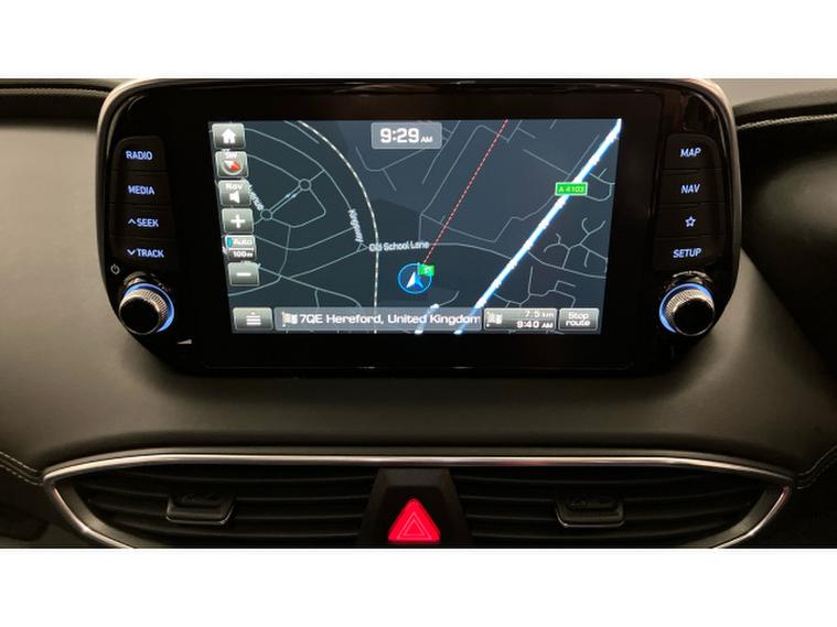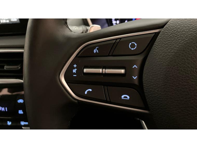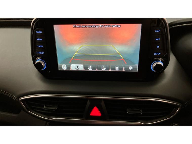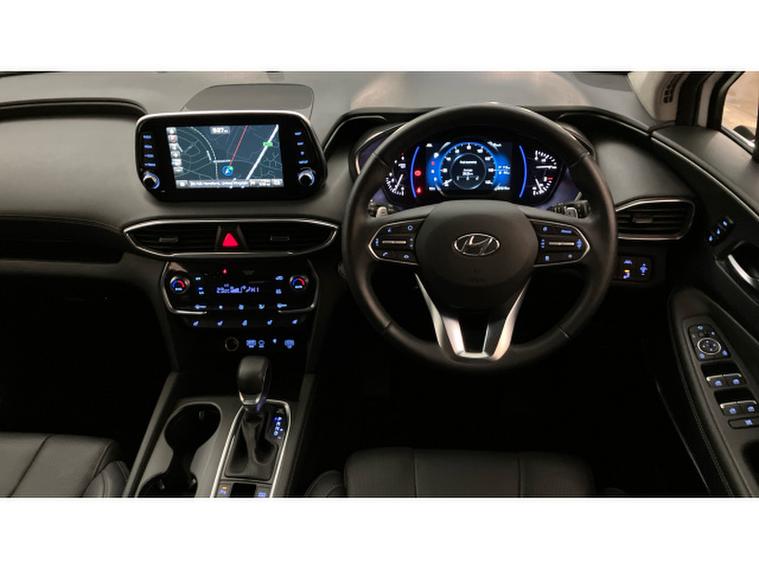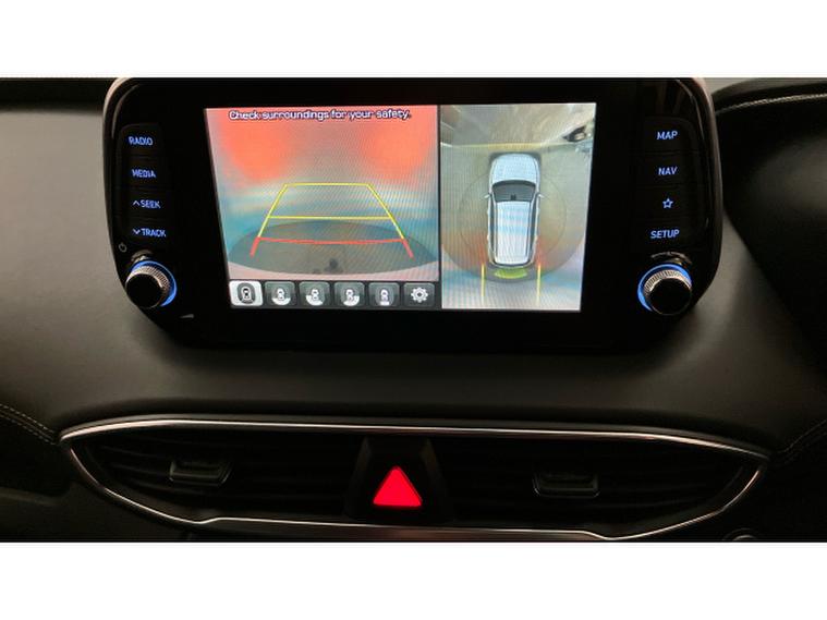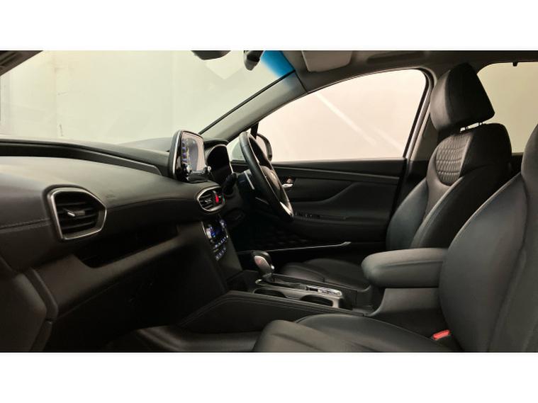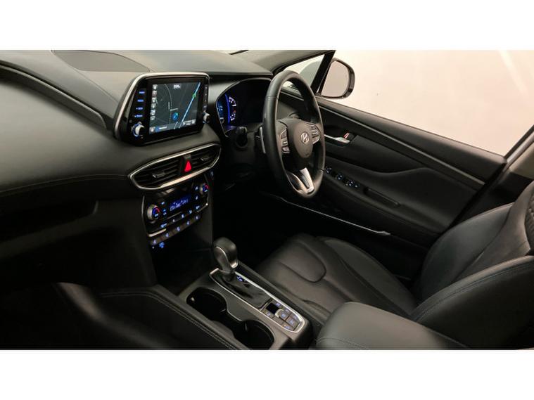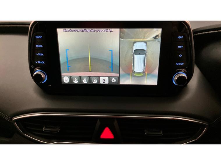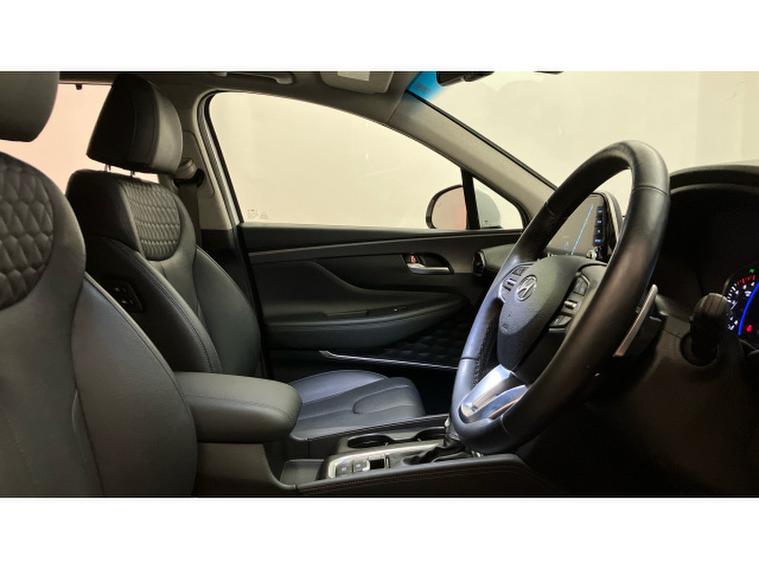 The Premium SE specification is immediately evident. 19-inch two-tone alloy wheels, silver roof bars and tinted rear windows give the Santa Fe a confident, upmarket presence, while everyday usability is enhanced by keyless entry and start, power folding mirrors and a hands-free power tailgate. Parking and manoeuvring are made reassuringly easy thanks to front and rear sensors and a 360-degree camera system.