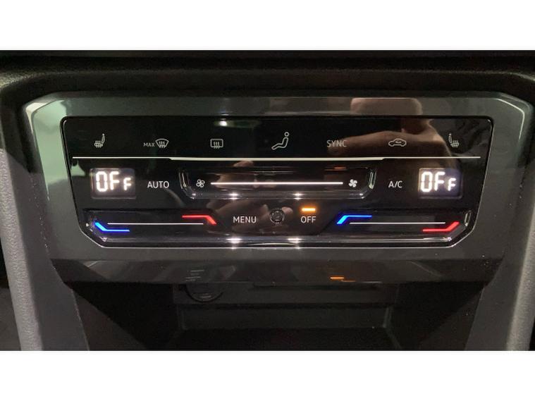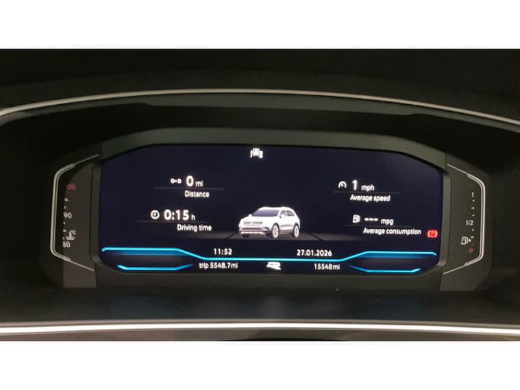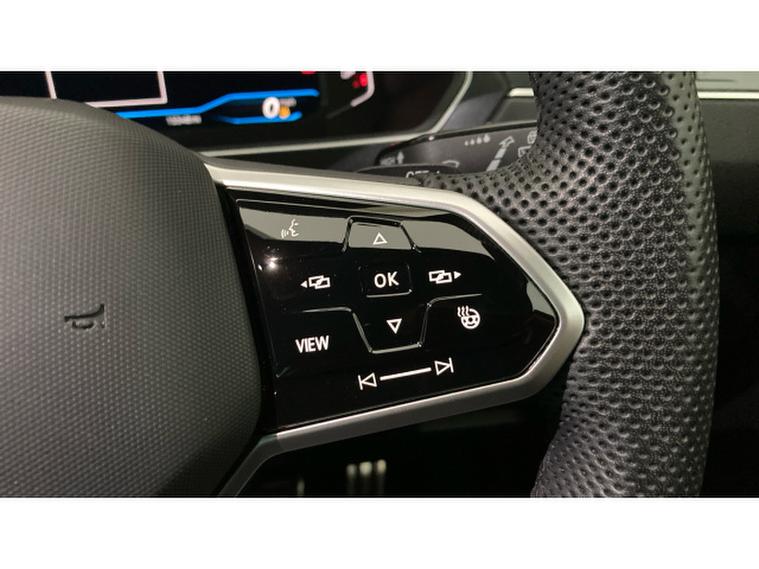 The R-Line styling is complemented by striking 20 Misano alloy wheels, sports suspension lowered by approximately 10mm, progressive steering, and rear privacy glass, giving the Tiguan a purposeful and athletic road presence. Inside, the cabin feels premium and driver focused, featuring a heated leather-wrapped multifunction sports steering wheel with touch controls and DSG shift paddles, along with heated front seats as part of the Winter Pack.