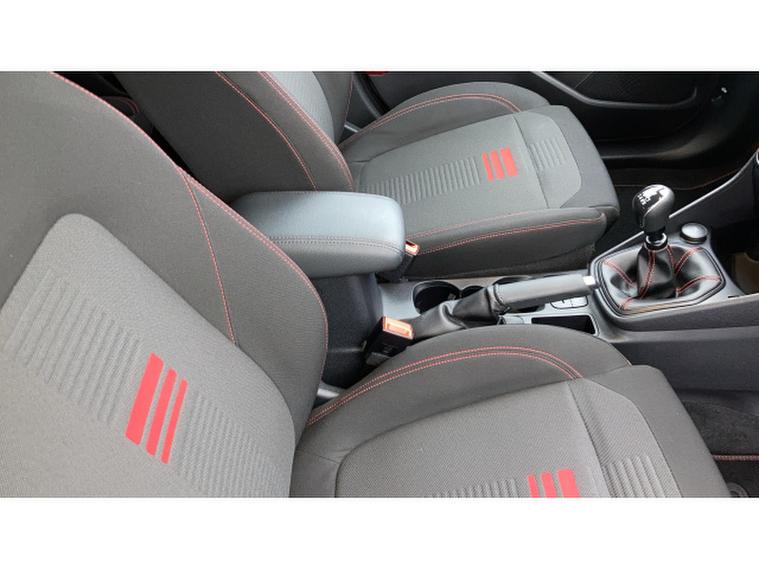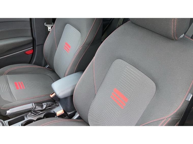 - Cloth upholstery with red stitching