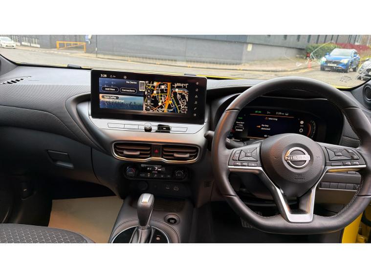 Styling is unmistakably Nissan with its bold V-Motion grille, sleek LED headlights and 17-inch alloy wheels that give the Juke a confident, dynamic road presence, while the sculpted bodywork and contrasting roof design add a modern, sporty edge to its character. Inside, the cabin offers comfortable seating with synthetic leather trim and a multifunction steering wheel that keeps essential controls close at hand. Safety is a priority with features such as intelligent emergency braking with pedestrian and cyclist detection, lane departure warning, blind-spot monitoring and rear cross-traffic alert, all engineered to help protect you and your passengers.