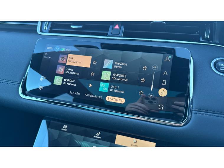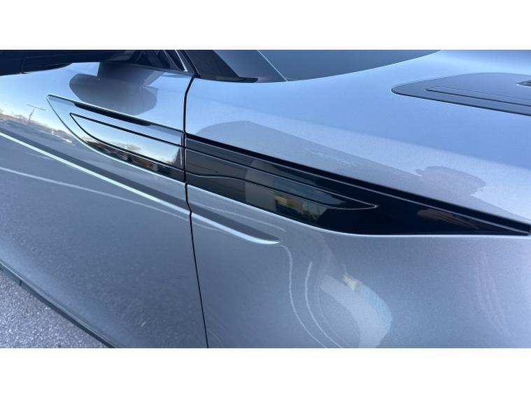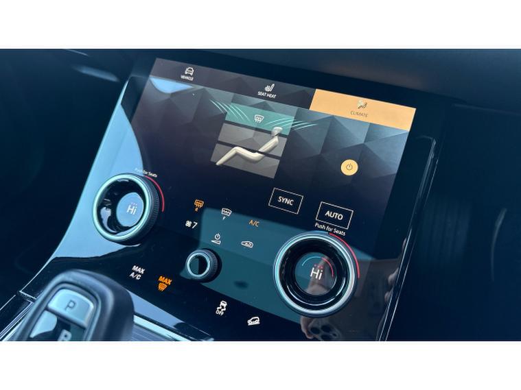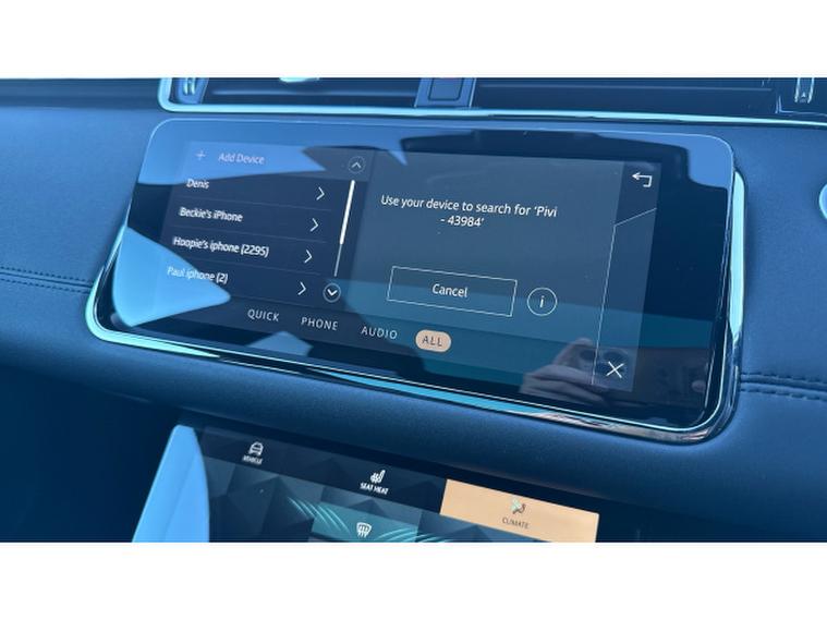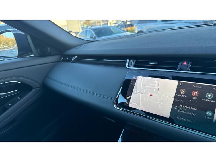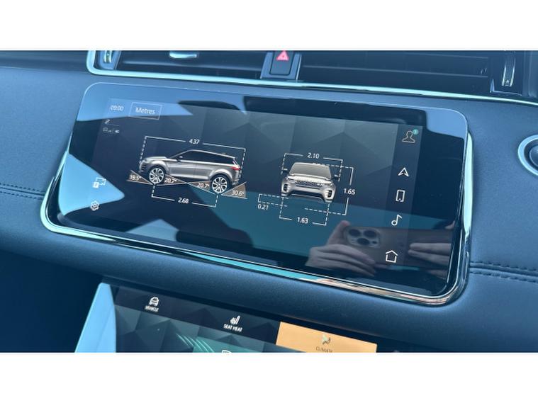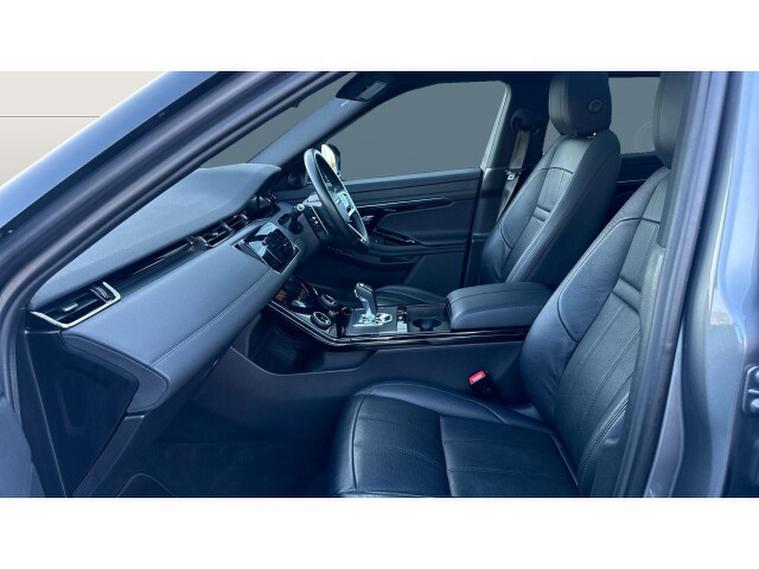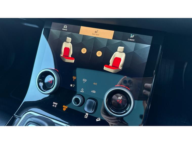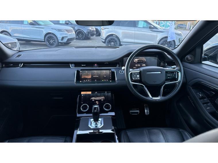 The R-Dynamic Black Exterior Pack, black contrast roof and 20 Style 5079 gloss black alloy wheels give this Evoque a sharp, purposeful stance that turns heads wherever it goes. Privacy glass enhances both style and rear passenger comfort, while the fixed panoramic sunroof floods the Ebony interior with natural light, creating an airy, premium cabin environment.