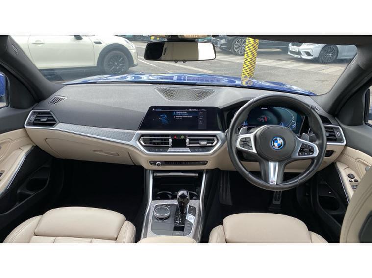 Finished in eye-catching Portimao Blue Metallic, this 330e makes a bold statement on the road. The athletic M Sport styling is beautifully complemented by 18 inch alloy wheels, giving the car a confident and dynamic stance. Step inside and you are welcomed by refined Oyster leather seats, creating a bright, premium cabin that perfectly balances sportiness with comfort.