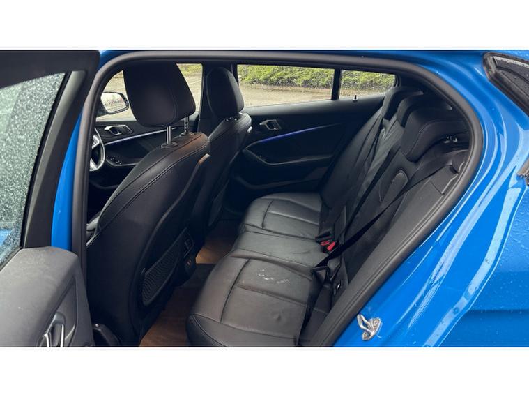 The exterior presents the sporty M Sport styling that sets this 1 Series apart from the standard model featuring an aggressive front bumper, aerodynamic side skirts, and bold 18 alloy wheels that perfectly complement the vibrant blue paintwork. Subtle details like blacked-out kidney grilles and M badging enhance its athletic stance, while the five-door layout ensures genuine versatility for daily life.