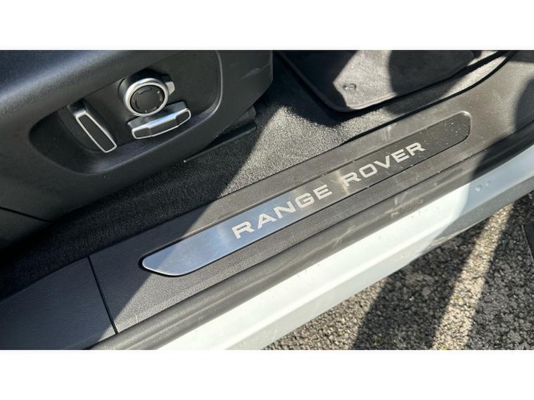 - Range rover branding illuminated metal tread plates in loadspace and row 1 with brand name script and metal in row 2