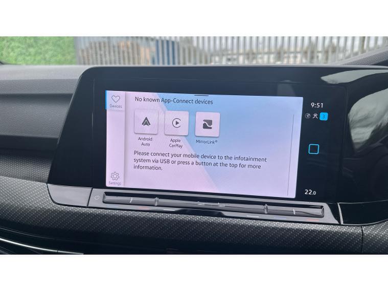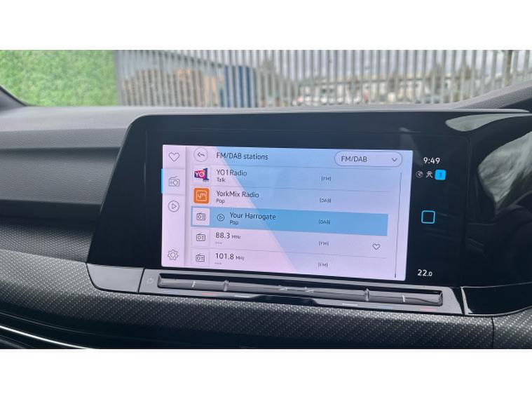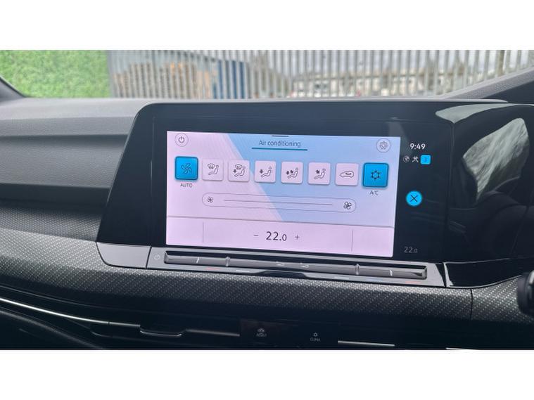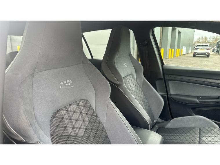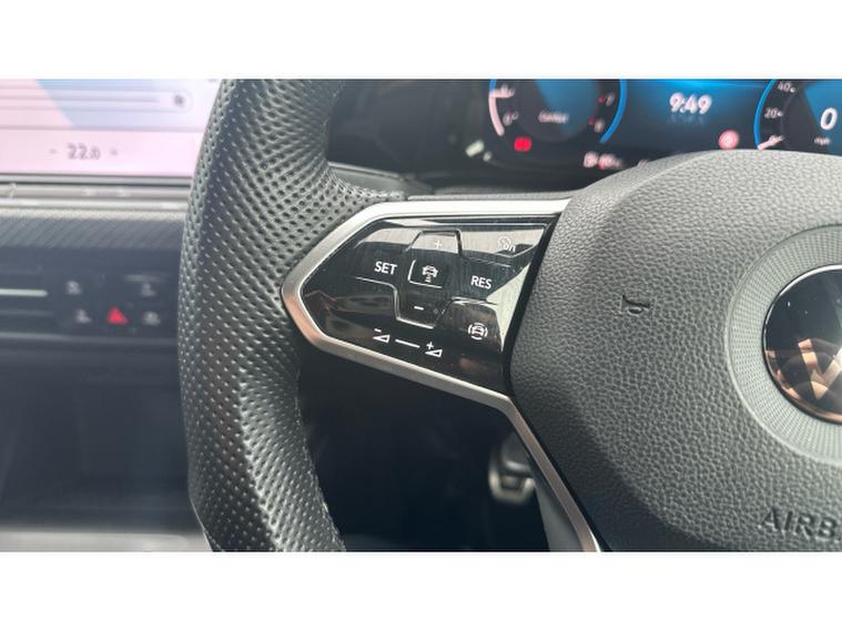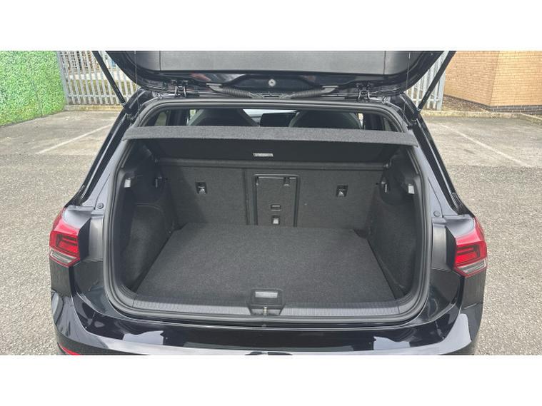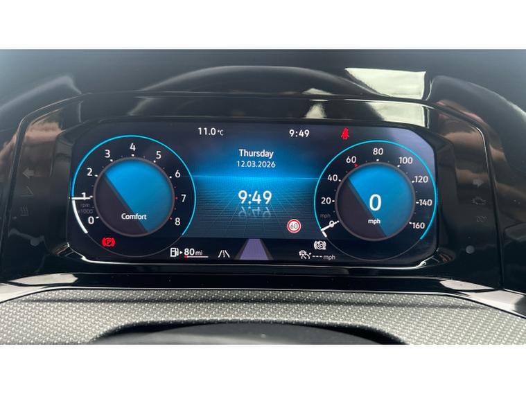 The R-Line styling gives the Golf a dynamic presence, enhanced by the Deep Black Pearl metallic paintwork and rear privacy glass. Inside, the cabin is finished in Anthracite and Titanium Black and features a heated, leather-wrapped multifunction sports steering wheel with touch controls, creating a modern and driver-focused environment.
