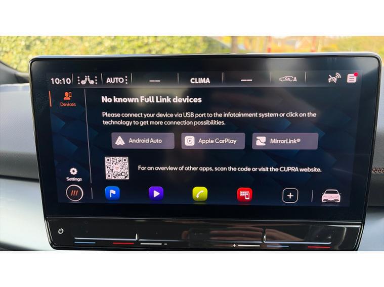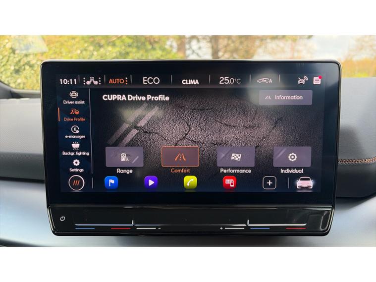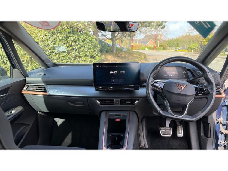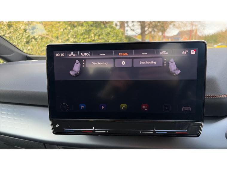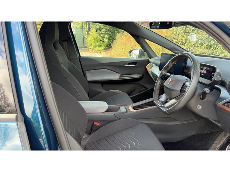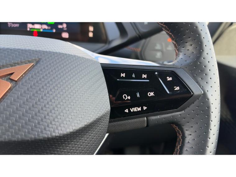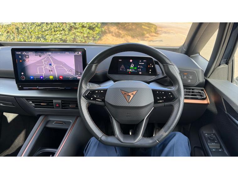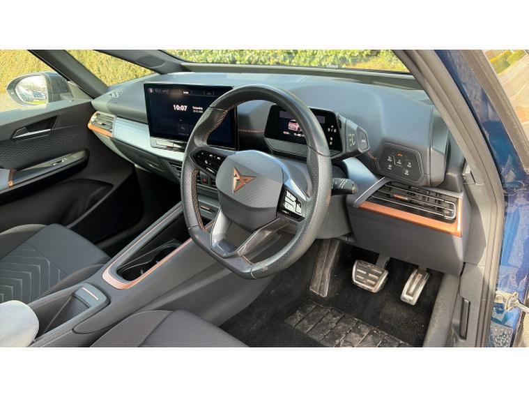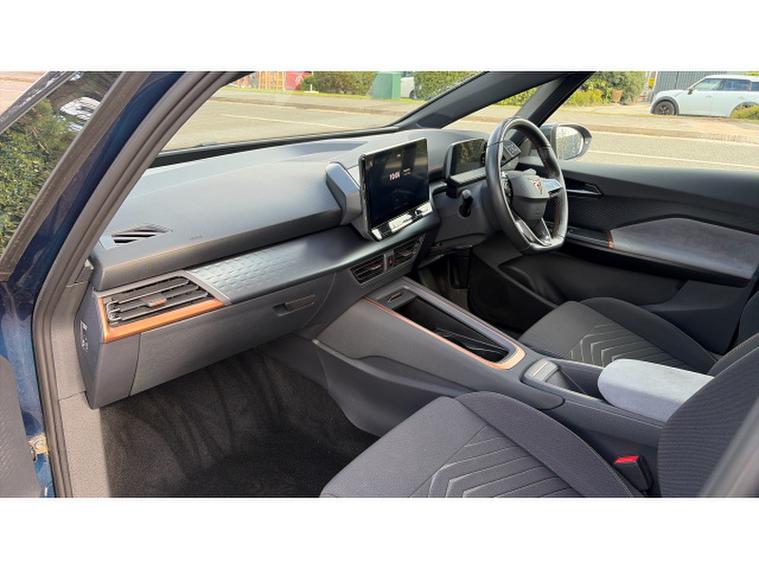 Step inside and the V2 specification reveals a cabin that feels both futuristic and driver-focused. A digital cockpit display provides all essential driving information at a glance, while the large central touchscreen infotainment system features integrated navigation and seamless smartphone connectivity via wireless Apple CarPlay and Android Auto. Heated front seats, a heated steering wheel and dual-zone climate control ensure comfort in all conditions, while ambient lighting and CUPRAs signature copper accents create a premium, sporty atmosphere. Advanced driver assistance systems including adaptive cruise control, lane assist, front and rear parking sensors and a rear-view camera make every journey safer and more relaxed.
