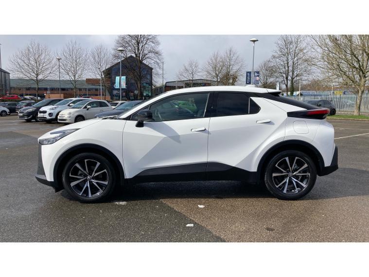 From the side, the C-HR maintains its coupe-SUV silhouette, with a sloping roofline and pronounced character lines. Flush or semi-hidden door handles (depending on trim) contribute to a cleaner, more aerodynamic profile. Strong wheel arches and large alloy wheels emphasize a sporty stance.
