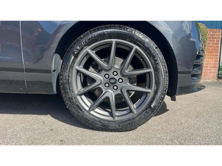 The Velar's sleek and minimalist design is perfectly complemented by 21" Style 5109 Satin Grey alloy wheels, giving the vehicle a confident and modern road presence. Its elegant profile is enhanced by a sliding panoramic sunroof, flooding the cabin with natural light and creating an open, spacious feel for all occupants.