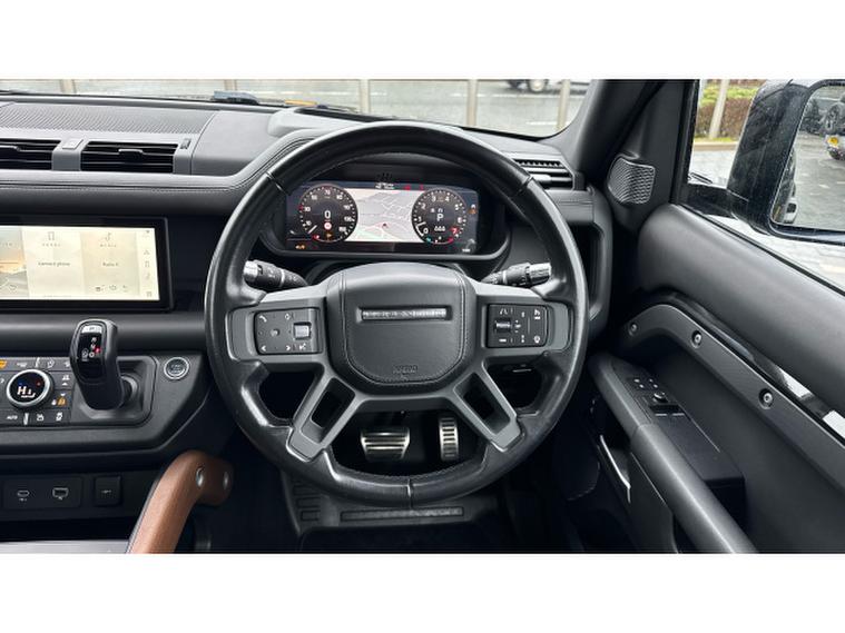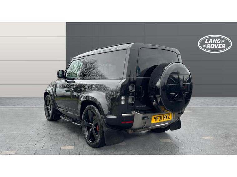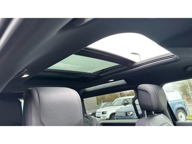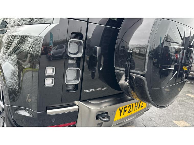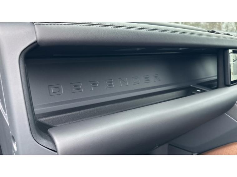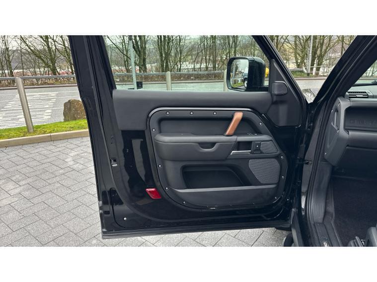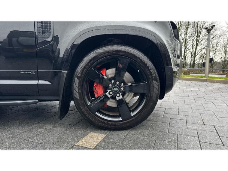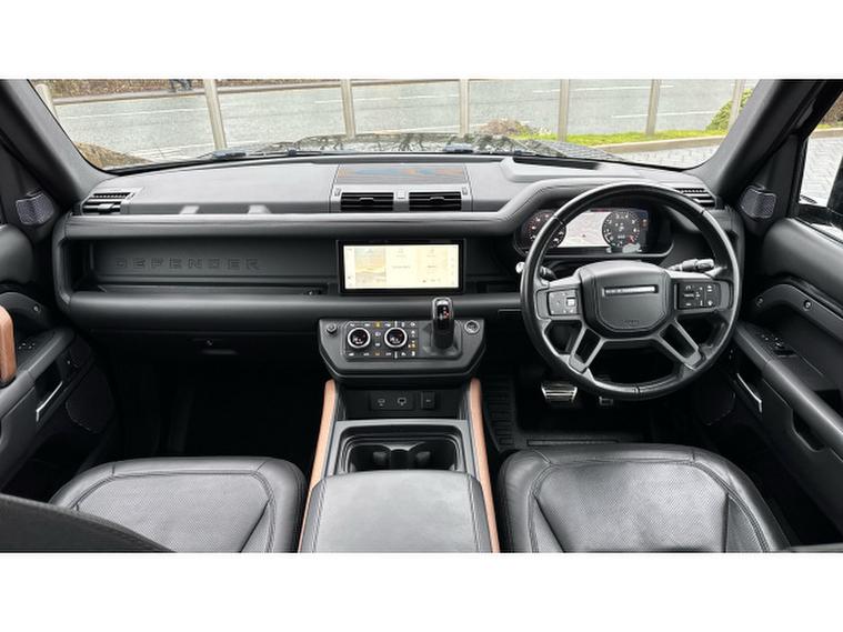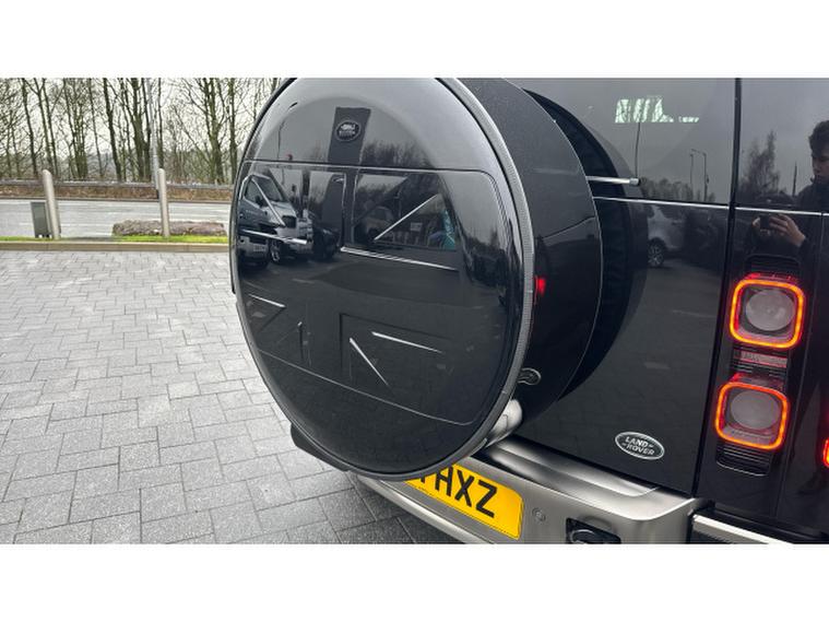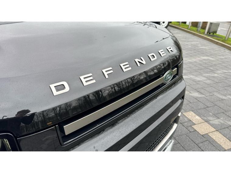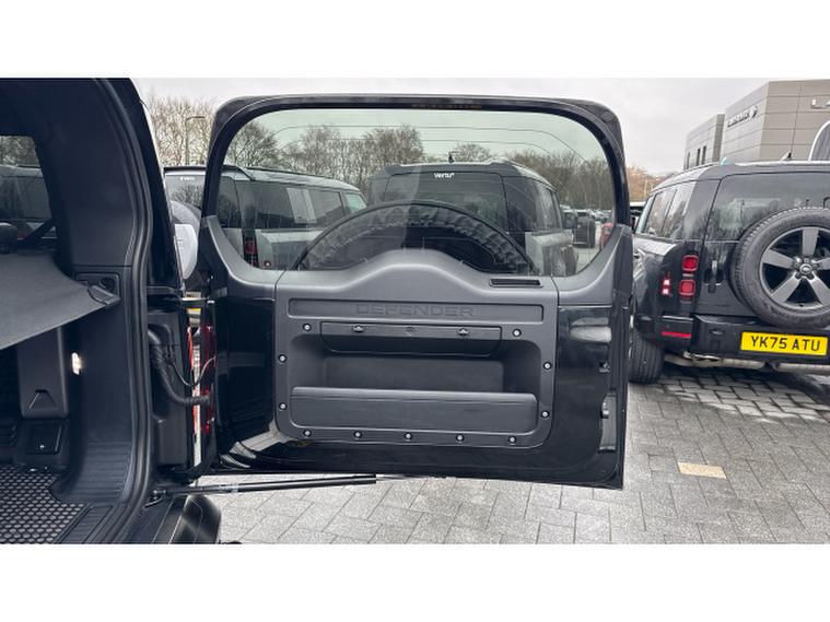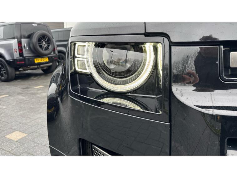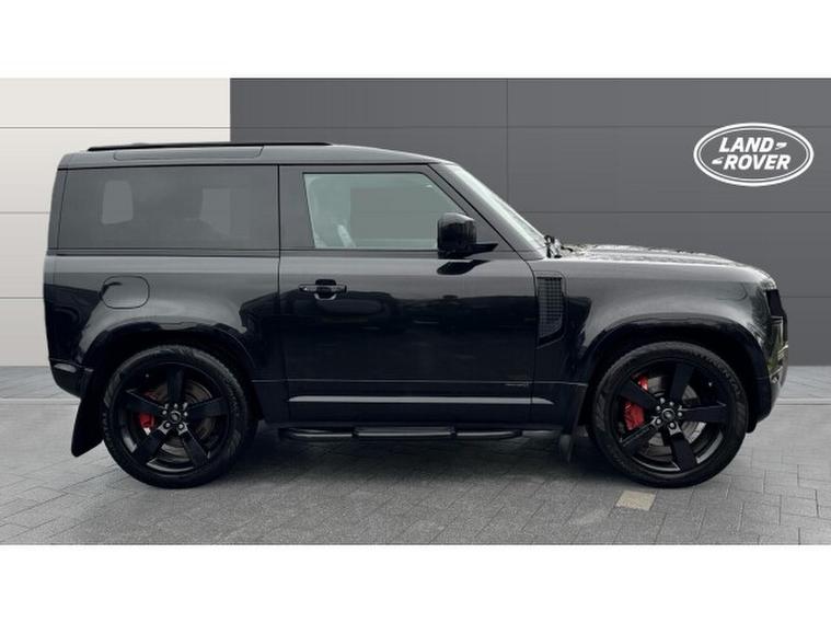 Land Rover Defender 3.0 P400 X 90 3dr Auto Petrol Estate, , Bold, powerful and unmistakably distinctive, this Land Rover Defender 90 P400 X in Santorini Black represents the model at its most refined and performance focused. The deep black finish enhances its strong, architectural lines, while 22 inch gloss black alloy wheels and privacy glass add a commanding and contemporary edge to its purposeful stance.