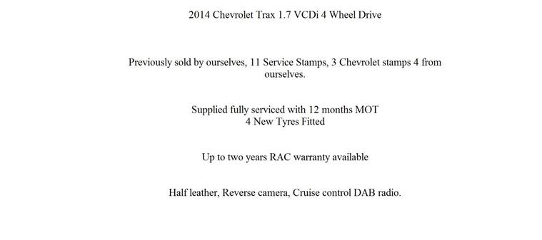 Supplying low mileage immaculate cars for over 40 years. Available to view at our Oldham branch is our rare Trax four wheel drive. Previously sold and serviced by ourselves with 11 service stamps in the book. Supplied fully serviced with 12 months MOT, 4 new tyres and up to 2 years RAC warranty available. Electric and heated wing mirrors, Electric windows, Auto headlights, Trip computer, Cruise control, DAB radio, Reverse camera, Air conditioning, 6 speed gearbox, Privacy glass, Half leather, Isofix, Spare wheel, Drivers passenger side and curtain airbags.