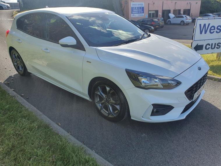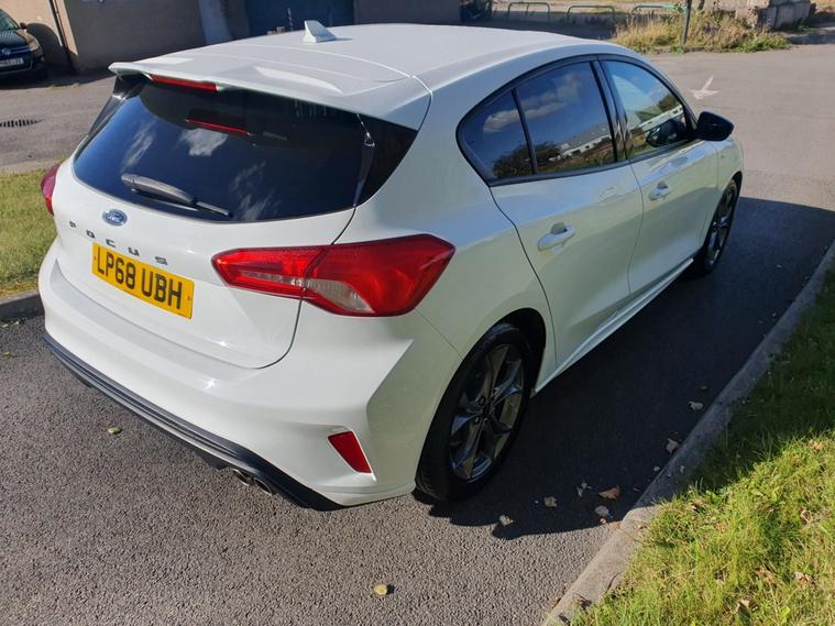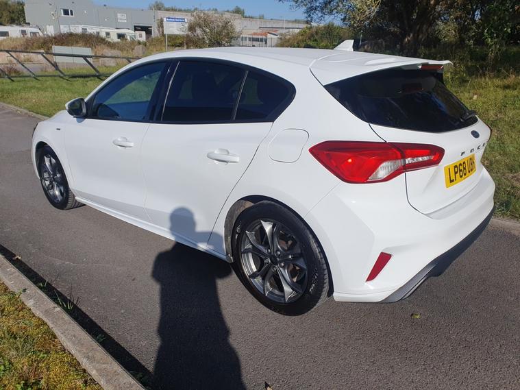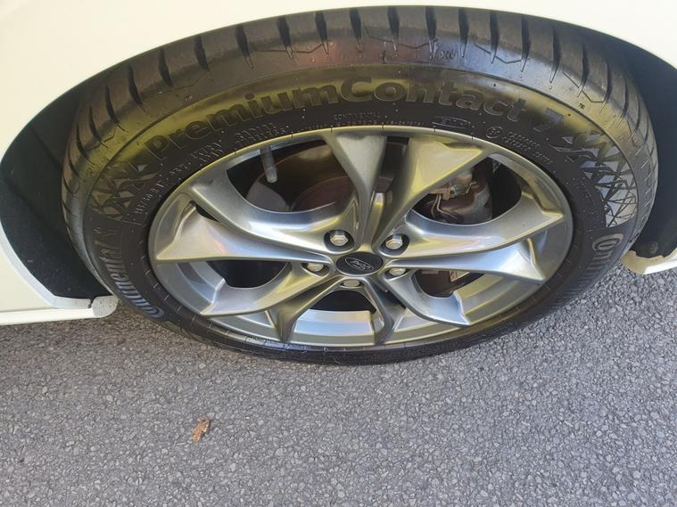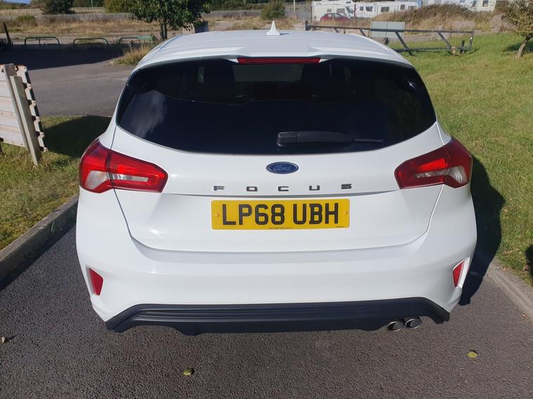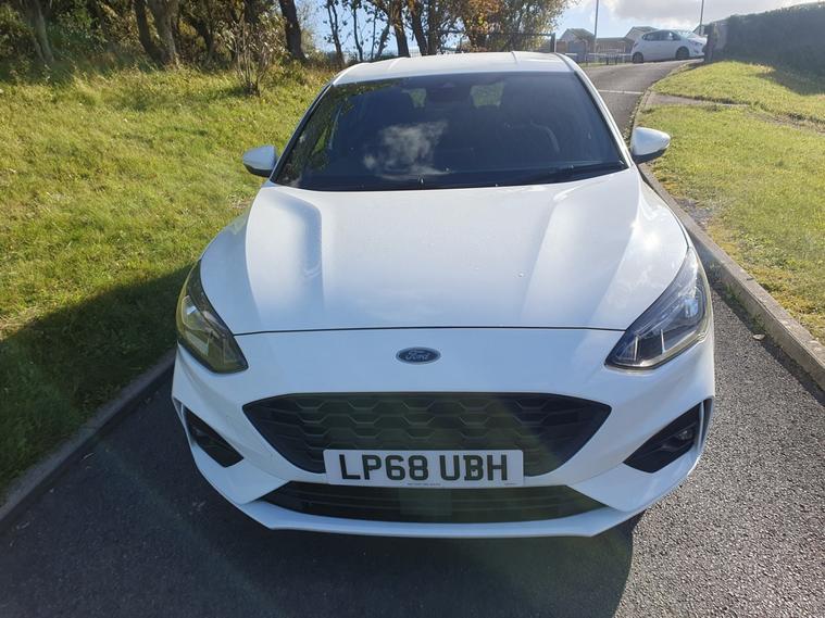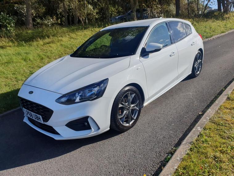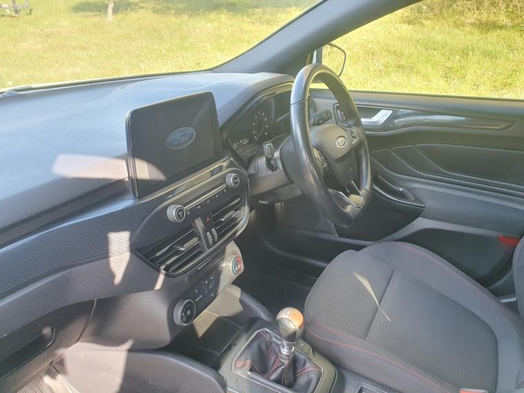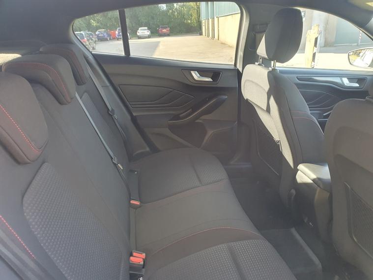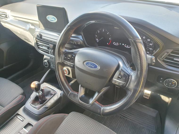 Eco mode, Ford SYNC 3 with 6.5" TFT touchscreen, DAB radio and app link Android auto/Apple carplay, Lane keeping aid with lane departure warning, PAS, Selectable drive mode, Sports tuned suspension, 6 speakers, Aux input, Quickclear heated windscreen/heated washer jets, Auto headlamps, Body colour large rear spoiler, Body colour side skirt, Body coloured electrically operated and heated door mirrors with side indicators, Electrically operated front and rear windows with one touch opening and closing, Halogen reflector headlamps, LED daytime running lamp, LED front fog lamps with cornering function, Polished twin tailpipe, ST-Line upper and lower grille with full body styling kit and wing badges, 3 spoke flat bottomed leather steering wheel with red stitching, 60/40 split back and cushion rear seats with 2 height adjustable headrests, Cloth upholstery with red stitching, Drivers lumbar support, Drivers seat manual height adjust, Isofix child seat preparation, Manual air conditioning, Reach + rake adjustable steering column, ABS+Electronic Brake force Distribution, Auto hold function, Driver airbag, Electronic parking brake, Electronic stability control, Front passenger airbag, Front side airbags, Hill start assist, Passenger airbag deactivate switch, Post collision braking, Pre collision assist with autonomous emergency braking and pedestrian/cyclist detection, Side curtain airbags, Keyless start with Ford Power starter button, MyKey system, Remote central locking & engine immobiliser, Thatcham category 1 alarm, Contrast stitching - Red, 17" 5x2 spoke alloy wheels with rock metallic finish