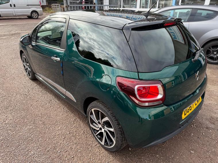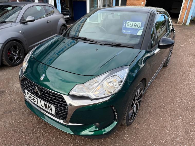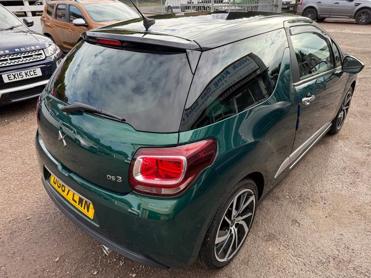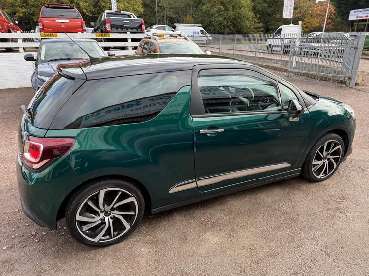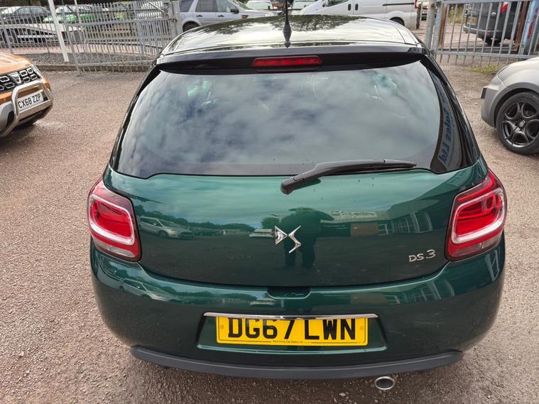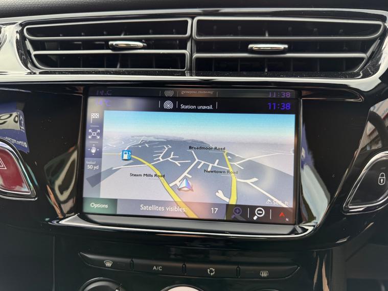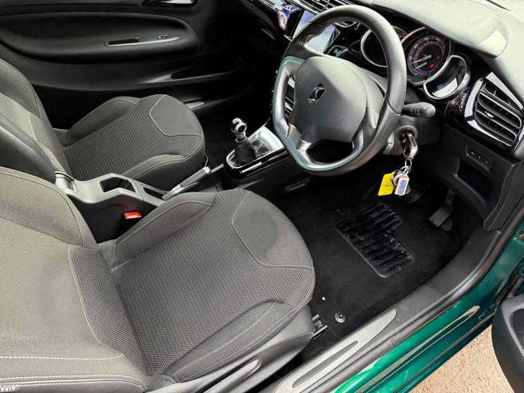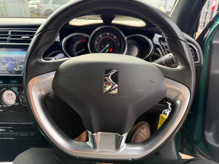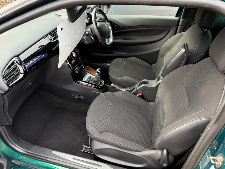5 three point inertia reel seatbelts, Curtain airbags, Driver seatbelt warning indicator, Driver/Front Passenger airbags, Front lateral airbags, Front seatbelt pretensioners with force limiters, Tyre pressure monitoring system, Alarm, Deadlocks, Immobiliser, Locking wheel bolts, Remote control central locking, Anti-lock Brake System + Electronic Brakeforce Distribution + Emergency Brake Assit, Electronic Stability Programme, Hill start assist, Sports suspension, Electric adjustable door mirrors, Roof colour door mirrors, Dark tinted rear windows, Electric front windows, Rear wiper, Black roof, Body coloured bumpers, Chrome door handles, Chrome DS Wings grille, Chrome exhaust tailpipe, Chrome rear bumper inserts, Chrome side rubbing strips, 3D effect LED rear lights, Height adjustable headlamps, LED daytime running lights, LED front fog lights, Driver's seat height adjustment, Front and rear headrests, Front seat and rear pockets, Isofix rear child seat preparation, Split folding rear seat, Gloss black centre console and interior door handle surround, Tungsten dashboard strip, Floor mats, Boot light, Front courtesy lights, Front reading light, Instrument lighting dimmer, Interior mood lighting, Driver/passenger sunvisor/covered courtesy mirrors, 12V socket, Front armrest, Front door pockets with bottle holders, Gloss black gear knob, Height/reach adjust steering wheel, Lashing eyelets in boot, Leather handbrake with chrome insert, Leather steering wheel, Rayados cloth upholstery, Satin chrome door sill protectors, Satin chrome steering wheel inserts, Automatic air conditioning, Pollen filter, Cruise control + speed limiter, DS connect box emergency assist system, Variable power steering, 7"" touch screen, eMyWay Satellite Navigation, Mirror screen with mirror link and car play, Multi function trip computer, Outside temperature display, Rev counter, Service interval indicator, Bluetooth + USB, 6 speakers, Auxiliary input socket, DAB Digital radio, Steering wheel mounted controls, 17"" Aphrodite black diamond cut alloy wheels, Tyre repair kit
