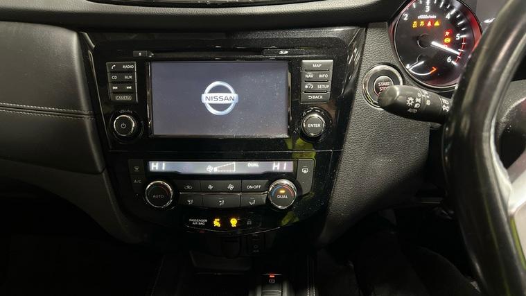 3 point seatbelts on all seats, Child locks on rear doors, Driver and passenger airbags, First aid kit, Front and rear curtain airbags, Seatbelt warning, Tyre pressure monitoring system, Warning triangle, Alarm, Immobiliser, Intelligent Key, Remote central locking, Anti-lock brake system, Electronic Brakeforce Distribution + Brake Assist, Electronic parking brake, Electronic Stability Programme + traction control, Hill hold assist, Intelligent emergency braking with pedestrian recognition, Automatic dimming rear view mirror, Body colour door mirrors, Electric folding door mirrors, Electric heated door mirrors, Automatic rain sensing wipers, Front and rear power windows, Rear privacy glass, Black honeycomb front grille, Chrome door handles, Chrome window surround, Panoramic sunroof, Satin silver roof rails, Shark fin roof aerial, Solid paint, Automatic headlights, Front fog lights, LED daytime running lights, 3 rear headrests, 60/40 split rear bench seat, Height adjustable driver/front passenger seats, Height adjustable front headrests, Isofix child seat attachment, Lumbar support, Individual rear reading lights, Centre console storage box/armrest, Cloth upholstery, Configurable luggage board system, Front and rear door pockets with bottle holders, Front cupholders, Leather steering wheel and gear knob, Rake/reach adjustable steering wheel, Rear armrest, Synthetic leather instrumental panel inserts, Synthetic leather knee pad, Dual zone climate control, Pollen filter, Automatic tailgate opening, Around View Monitor, Attention assist, Cruise control + speed limiter, Engine start button, Front and rear parking sensors, Lane departure warning system, Power assisted steering, Traffic sign recognition, 5"" TFT driver information centre, Nissan connect sat nav system, Trip computer, Bluetooth phone integration system, 6 speakers, Audio remote control in steering wheel, DAB Digital radio, Radio/CD, Smartphone apps, USB/aux input socket, 18"" Alloy wheels, Full size spare wheel