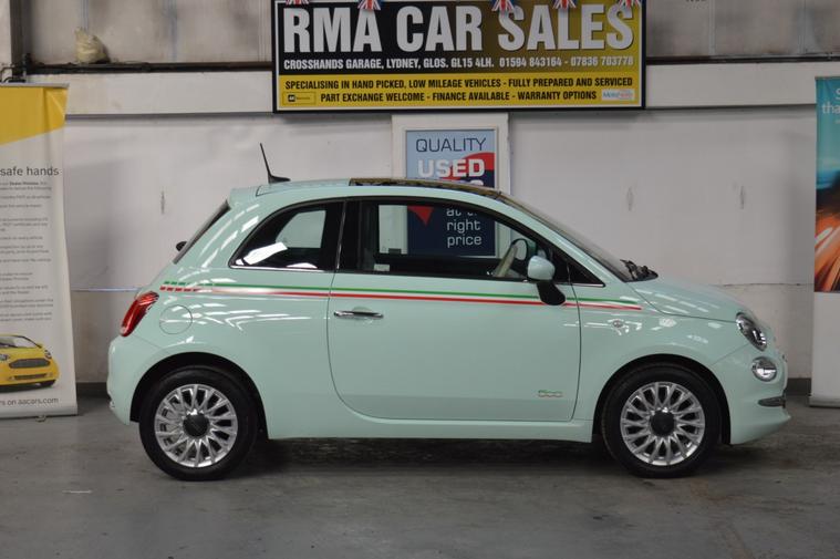 FIAT 500 1.2 LOUNGE 3dr. AN OUTSTANDING LOW MILEAGE EXAMPLE WITH JUST 22000 MILES ON THE CLOCK, ONE LADY OWNER FROM NEW AND SUPPORTING SERVICE HISTORY TO INCLUDE A SERVICE AND CAMBELT CHANGE JUST UNDERTAKEN BY OURSELVES. THE EVER POPULAR FIAT 500 IS AN EXCELLENT COMMUTER CAR WHICH IS USER FRIENDLY AND VERY ECONOMICAL. INSIDE IS SPOTLESSLY CLEAN AND THE BODYWORK IS FREE FROM ANY DINGS, DENTS OR BLEMISHES, WE ARE SURE YOU WILL NOT BE DISAPPOINTED. THE CAR COMES WITH UNMARKED ALLOY WHEELS TO INCLUDE 2 NEW FRONT TYRES, DAYTIME RUNNING LIGHTS, COLOUR CODED BUMPERS AND MIRRORS, REAR PARK ASSIST, PANORAMIC GLASS SUNROOF WITH MANUAL SUN BLIND, FRONT FOGS, TINTED GLASS, PERFECT CLOTH UPHOLSTERY WITH CONTRASTING LEATHER, 5 INCH COLOUR TOUCH SCREEN WITH FIAT UCONNECT MULTIMEDIA SYSTEM, DAB RADIO WITH AUX/USB INTERFACE, BLUETOOTH TELEPHONE CONNECTIVITY, VOICE COMMANDS, CLIMATE CONTROL, AIR CONDITIONING, CITY FUNCTION TO LIGHTEN THE STEERING AND HELP FACILITATE EASIER PARKING, ELECTRIC WINDOWS AND MIRRORS, REMOTE CENTRAL LOCKING AND 2 x KEYS. AS WE ARE AN AA CARS DEALER THIS VEHICLE COMES WITH A FULL AA HISTORY CHECK AND ALSO 12 MONTHS AA BREAKDOWN COVER. EXTENDED AA WARRANTY AVAILABLE. WE ARE ALSO A MEMBER OF THE AA DEALER PROMISE SCHEME. NEW MOT ISSUED ON PURCHASE. WE PRIDE OURSELVES ON THE PRESENTATION OF OUR VEHICLES WHICH ARE FULLY VALETED AND PREPARED TO THE VERY HIGHEST OF STANDARDS. AS A RESULT WE FIRMLY BELIEVE THAT OUR FORECOURT IS UNRIVALLED AND OUR REPUTATION FOR SELLING PREMIUM USED CARS IS SECOND TO NONE. WALK AROUND VIDEO AND DELIVERY OPTIONS ARE AVAILABLE UPON REQUEST.