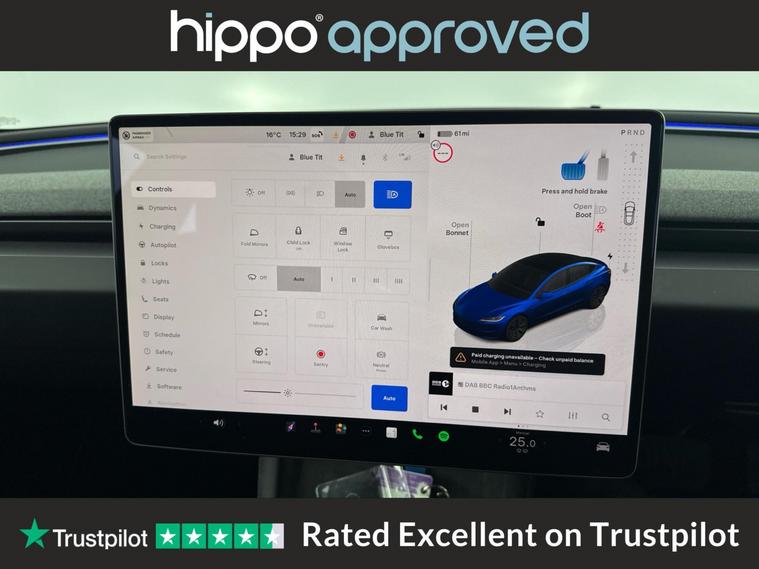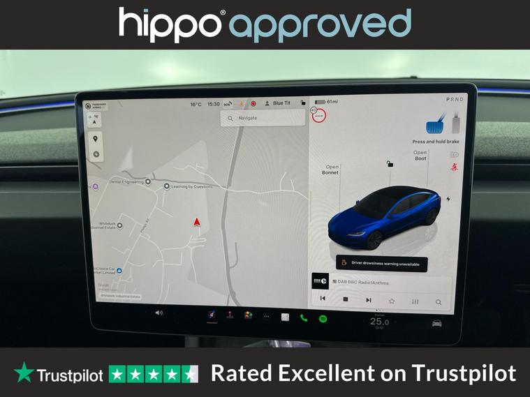Offered by Hippo Approved, this Tesla Model 3 Saloon 4dr Electric Auto RWD (208 ps) has covered 17, 337 miles and presents a compelling blend of performance, efficiency, and comfort. Fitted with 18-inch Photon alloy wheels, the vehicle is equipped for a smooth and confident drive. The dual-zone climate control and heated steering wheel ensure year-round comfort for all occupants, while a tinted panoramic glass roofincluding ultraviolet and infrared protectionenhances the cabins ambience and comfort. This Model 3 is equipped with advanced features such as adaptive cruise control and a park assist camera, contributing to a confident and convenient driving experience. Connectivity is facilitated through Bluetooth, and entertainment is delivered via a digital radio and the OEM sound system. The integrated navigation system makes every journey straightforward and stress-free. Hippo Approved is known for a wide selection of vehicles suited for various needs and budgets. Each car undergoes a rigorous 130-point quality and safety inspection at our state-of-the-art 3 million preparation centre, ensuring your peace of mind. Additionally, we offer tailored finance packages for personal and business use, making it easy to acquire your ideal car.