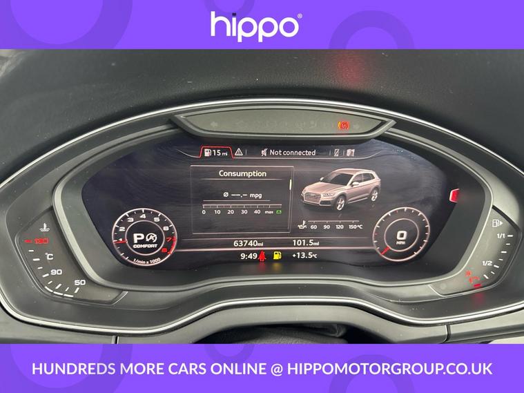 Presenting this Audi Q5 2.0 TFSI 45 Black Edition SUV, featuring a robust 245 PS petrol engine paired with S Tronic automatic transmission and quattro all-wheel drive, compliant with Euro 6 standards. With a recorded mileage of 63, 378 miles and a full service history including four services, the most recent at 56, 000 miles, this vehicle demonstrates responsible upkeep. A highlight of this Q5 is the panoramic glass sunroof, allowing for an airy and bright interior, enhancing the overall driving experience. The exterior is complemented by 20-inch alloy wheels in a 5-arm rotor design, finished in gloss anthracite black with diamond-cut detailing from Audi Sport, contributing to both style and presence. This Audi Q5 combines performance with aesthetic appeal while providing assurance in terms of maintenance and servicing. Hippo Approved is known for a wide selection of vehicles suited for various needs and budgets. Each car undergoes a rigorous 130-point quality and safety inspection at our state-of-the-art 3 million preparation centre, ensuring your peace of mind. Additionally, we offer tailored finance packages for personal and business use, making it easy to acquire your ideal car.