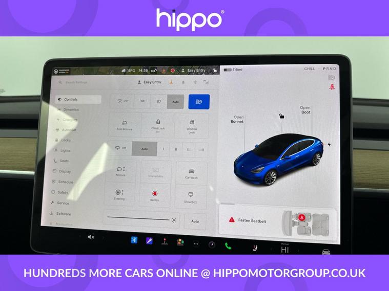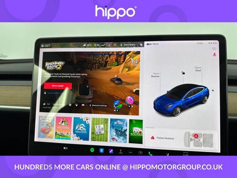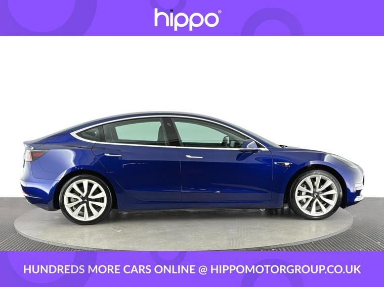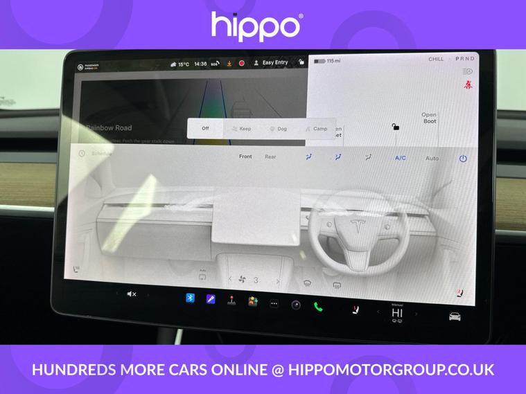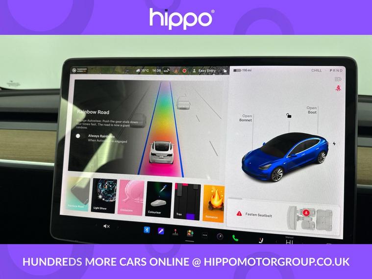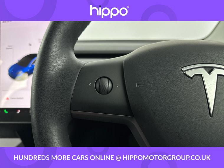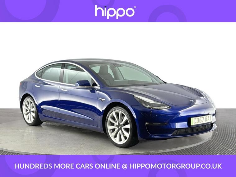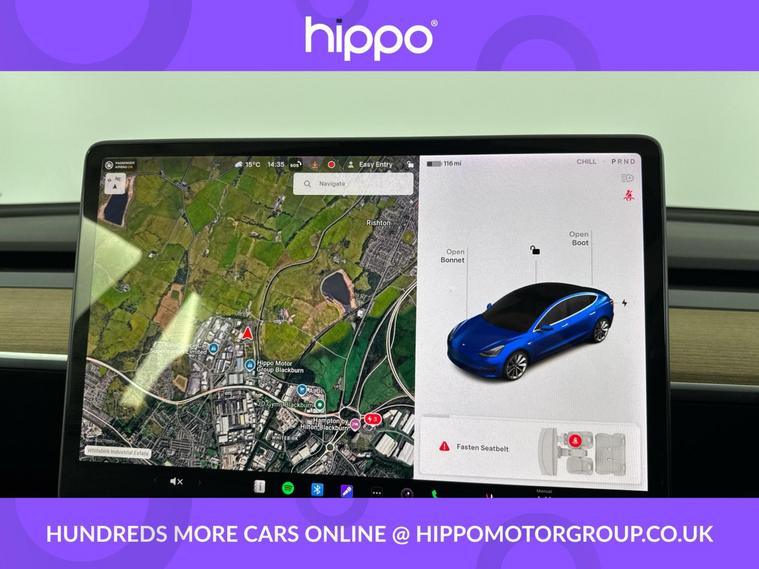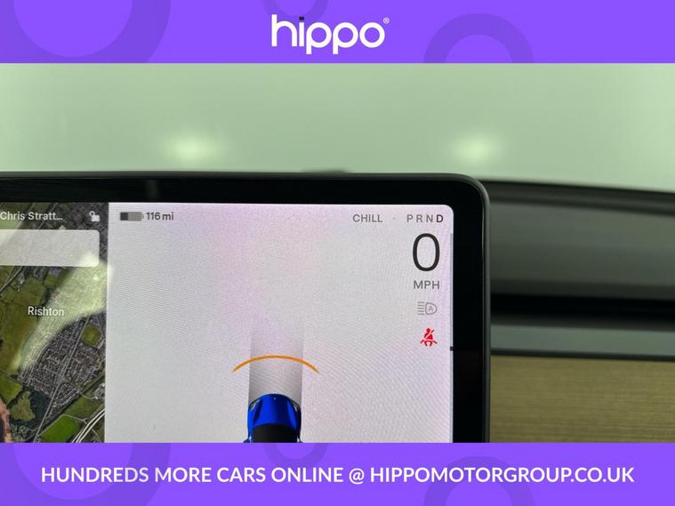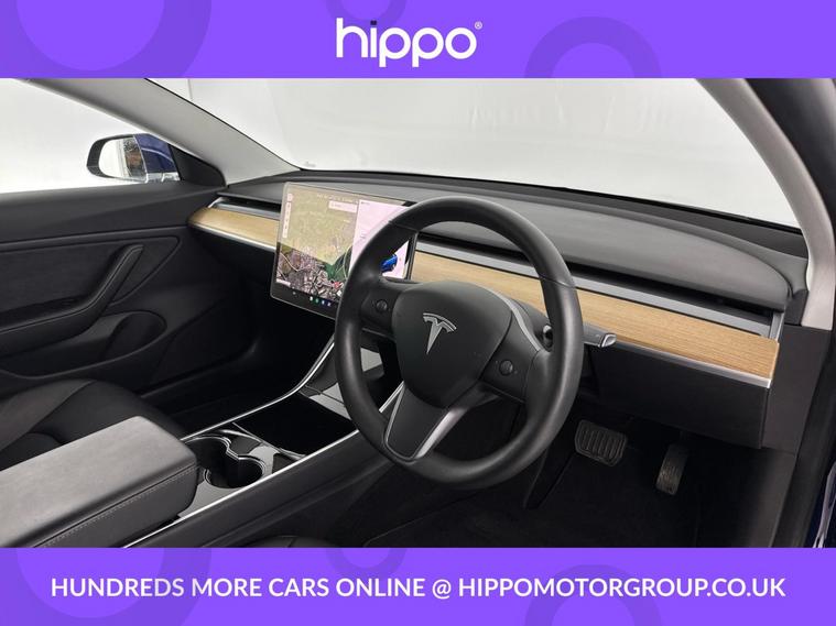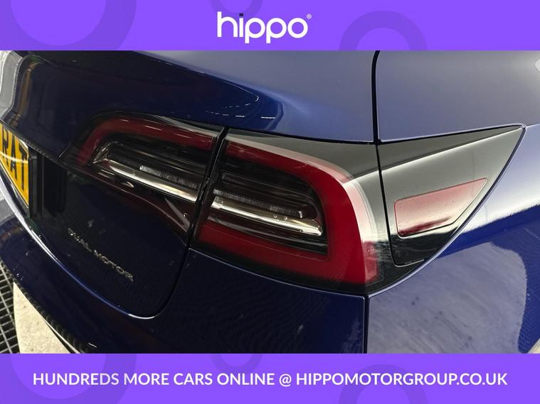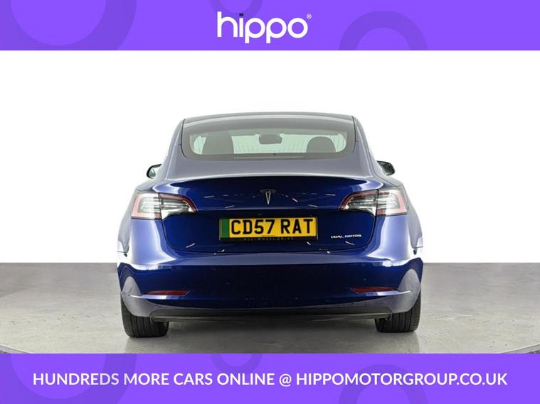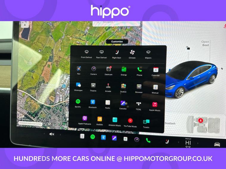 Tesla Model 3 (Dual Motor) Long Range Saloon 4dr Electric Auto 4WDE, having covered just 22, 529 miles. This all-electric saloon features all-wheel drive, providing reliable performance in various conditions. The spacious interior includes a distinctive 15-inch touchscreen with onboard maps and navigation, as well as satellite-view maps with live traffic visualisation. Connectivity is straightforward with Bluetooth, while the OEM sound system offers clear audio. Comfort is assured with heated front seats and two-zone climate control. The fixed panoramic glass rooftinted and equipped with ultraviolet and infrared protectionensures a light-filled, comfortable cabin. Driving assistance features include adaptive cruise control, steering wheel-mounted controls, and both front and rear parking sensors. The vehicle also benefits from a park assist camera and reverse parking aid for easier manoeuvring. Completing the specification are 18-inch Aero alloy wheels. Hippo Approved is known for a wide selection of vehicles suited for various needs and budgets. Each car undergoes a rigorous 130-point quality and safety inspection at our state-of-the-art 3 million preparation centre, ensuring your peace of mind. Additionally, we offer tailored finance packages for personal and business use, making it easy to acquire your ideal car.