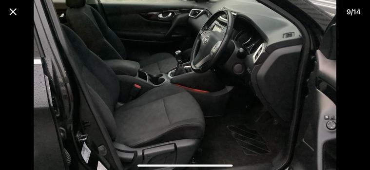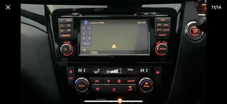 Child locks on rear doors, Curtain airbags, Driver/front passenger airbag, Height adjustable front seatbelts, Side airbags, Three 3 point rear seatbelts, Tyre pressure monitoring system, Alarm, Immobiliser, Intelligent Key, Remote central locking, Anti-lock Brake System, brake assist and Electronic Brakeforce Distribution, Electronic parking brake, Electronic Stability Programme + traction control, Hill start assist, Diesel particulate filter, Electric folding and heated door mirrors, Interior mirror with automatic anti dazzle, 2 speed wipers+variable intermittent wipe, Electric front/rear windows, Privacy glass, Rain sensor windscreen wipers, Rear wiper, Black honeycomb front grille, Body colour bumpers, Body colour door mirrors and handles, Chrome window surround, Panoramic sunroof with one touch shade, Satin silver roof rails, Solid paint, Automatic headlamp activation, Front fog lights with chrome surrounds, High beam assist, LED daytime running lights, 60/40 split folding rear seat, Driver's lumbar support, Driver/passenger front seatback pockets, Front headrests, Front seat belt pre-tensioners with load limiters, Height adjustable driver's seat, Height adjustable passenger seat with lumbar support, Isofix child seat preparation, Rear headrests, Ambient interior lighting, Footwell ambient lighting, Illuminated glovebox, Map reading lamp, 12V socket, Cloth upholstery, Front armrest, Front cupholders x 2, Leather gearknob, Leather steering wheel, Luggage area divider, Rake/reach adjustable steering wheel, Rear armrest with 2 cupholders, Dual zone climate control, Pollen filter, Push button starter, Around View Monitor, Cruise control, Forward collision warning, Front and rear parking sensors, Lane departure warning system, Power assisted steering, Speed limiter, Traffic sign recognition, Nissan connect sat nav system, Service interval indicator, Trip computer, Bluetooth phone integration system, 6 speakers, Audio remote control, DAB radio/CD player, USB/aux input socket, 18"" Alloy wheels, Tyre puncture repair kit