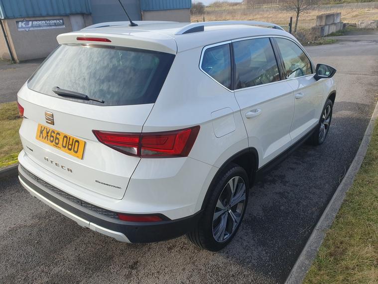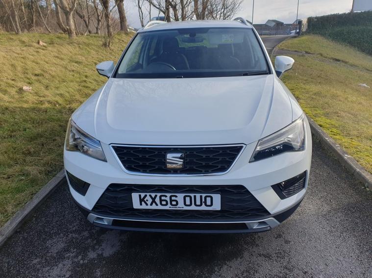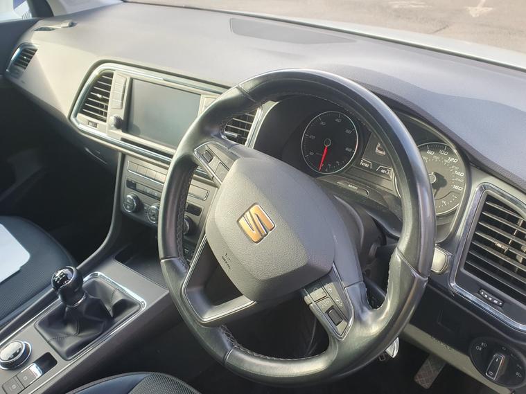 £35 Road Tax, Driver alert system, Electric speed sensitive power steering, Full Link App interface, Multi function display, Rear parking sensor, SEAT Drive profile, SEAT logo boot release, Comfort suspension, XDS electronic differential lock, Steering wheel mounted audio/phone controls, Aluminium roof rails, Cornering front fog lights, Electrically adjustable folding and heated door mirrors, Front and rear electric windows, LED daytime running lights, LED Headlights, LED tail lights, 60/40 split folding rear seat, Comfort front seats, Dual zone climate control, Height adjustable drivers seat, Height adjustable passenger seat, Isofix child seat preparation, Leather steering wheel and gear knob, Rear central air outlet, Storage box under drivers seat, Navigation system pack, Seat Media System Plus pack, ABS, Auto hold function, Automatic post collision braking, Curtain airbags, Driver/Front Passenger airbags, Drivers knee airbag, Electronic parking brake, Electronic stability control, ESP+EBA, Front assist including city emergency braking, Front passenger airbag deactivation, Front side airbags, Hill hold control, Predictive pedestrian protection, Tiredness recognition system, Traction control, 2 folding remote keys with window open/close function, Immobiliser, Remote central locking, Volumetric alarm with back up horn, 18" Bi-colour alloy wheels
