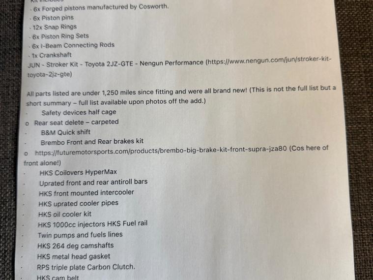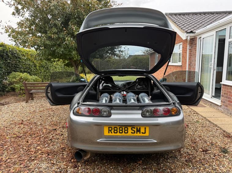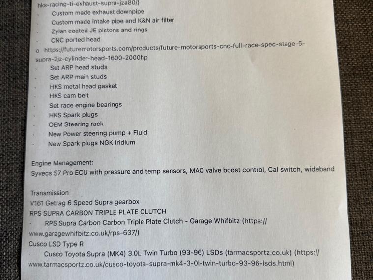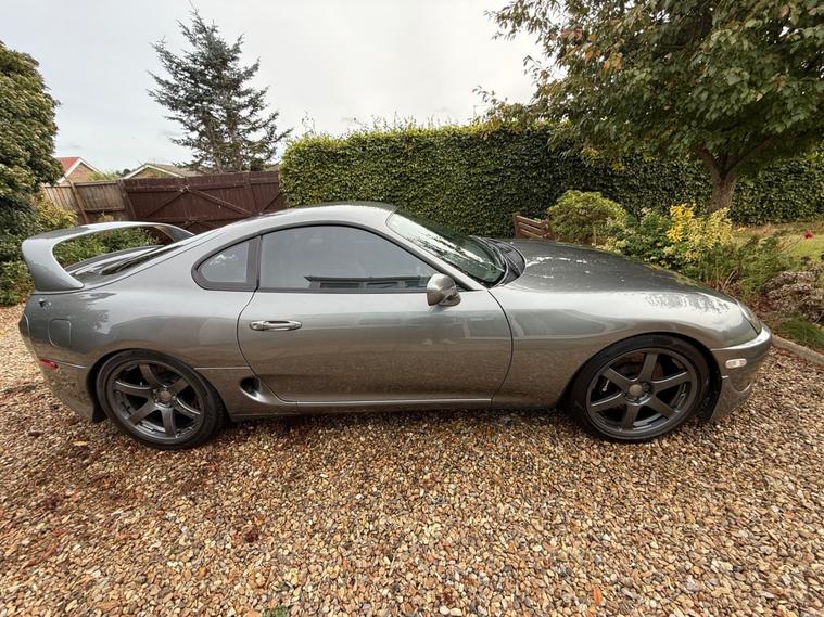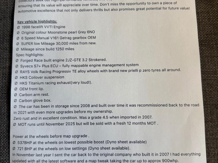 1998 Factory Manual Twin turbo 6 speed vvti 2JZGTE facelift. 900WHP.Key vehicle highlights:1998 facelift VVTI Engine.Original colour Moonstone pearl Grey 6NO.6 Speed Manual V161 Getrag gearbox OEM.SUPER low Mileage 30, 000 miles from new.Mileage since build 1250 miles.Spec highlights.Forged Race built engine 2JZ-GTE 3.2 Strokered.Syvecs S7+ Plus ECU fully mappable engine management system.RAYS Volk Racing Progressiv TE alloy wheels with brand new prielli p zero tyres all around. HKS Coilover suspension.HKS Titanium racing exhaust(very loud!).OEM front lip.Carbon arm rest.Carbon glove box.The car has been in storage since 2008 and built over time it was recommissioned back to the road in 2021 with even more upgrades before my ownership.Zero rust and in excellent condition. Was a grade 4.5 when imported in 2007.The current MOT runs until November 2025 but will be sold with a fresh 12 months MOT .- facelift headlights - facelift tail lights - facelift repeaters - facelift dash- facelift airbags. Strictly no timewasters Go a check out the other supras for sale and then come see this one .There isn't much on the market which comes close to this - Original milage, original colour, factory 6 speed manual turbo and then £115, 000 spend on the build .Pre booked Viewings welcome, the car is located in Norfolk.unfortunately because of the Cars value I will be the only one conducting test drives. Proof of funds must be ready to see before the car is driven by me and no group viewings of more than two people. (This rules out all the tyre kickers).£89, 995. Please note I have an agreed insurance evaluation with classic line on the car for £100, 000.(see pics).Thank you for taking the time to read my advert I hope I've covered everything.I have thousands of videos and photos of the car for anyone wishing to see. FULL SPEC CAN BE FOUND IN THE PICS OF THE ADVERT , CANT FIT THE FULL ADD IN THE ALLOWED TEXT ON HERE .