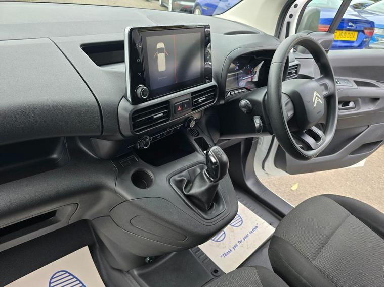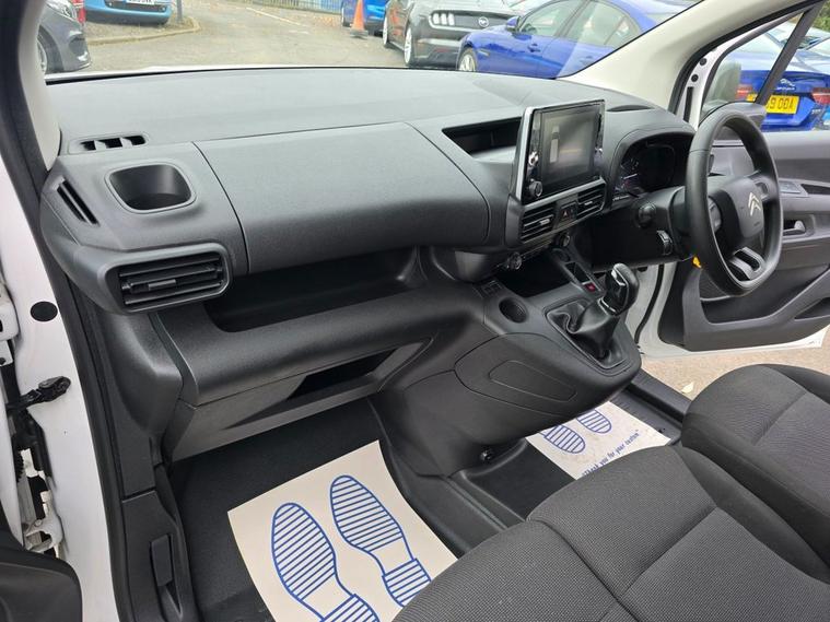 With only one owner and a full service history, this 2021 Citroen Berlingo 1.5 BlueHDi 1000 Enterprise M SWB Euro 6 is a reliable and well-maintained van. The BlueHDi 1000 Enterprise M derivative comes with a 1.5L diesel engine and is Euro 6 emission class compliant. The trim is Enterprise M. It has low mileage for its age, currently at 47200 miles. For peace of mind, the vehicle comes with a 3-month warranty and an MOT valid until April 2026. The last service was completed on 2025-04-23 at 46357 miles. Its equipped with rear parking sensors, air conditioning, and an 8in colour touchscreen with Citroen Connect DAB radio, Bluetooth, USB socket, and Aux-In jack. The vehicle also features height-adjustable halogen headlights. This Berlingo stands out with its impressive fuel economy of 54 mpg, meaning lower running costs compared to similar vans. The generous cargo volume of 3900 litres ensures you have ample space for all your needs, making it more practical than other vehicles in its class. The engine delivers 101 bhp, providing a good balance of power and efficiency. Furthermore, its low CO2 emissions make it an environmentally conscious choice.