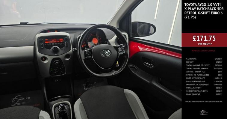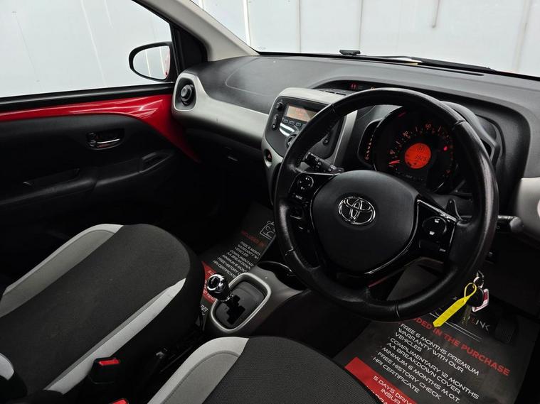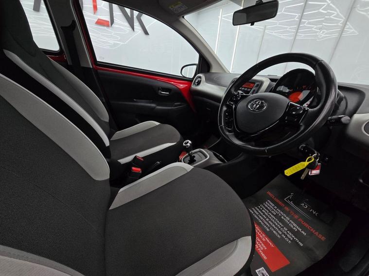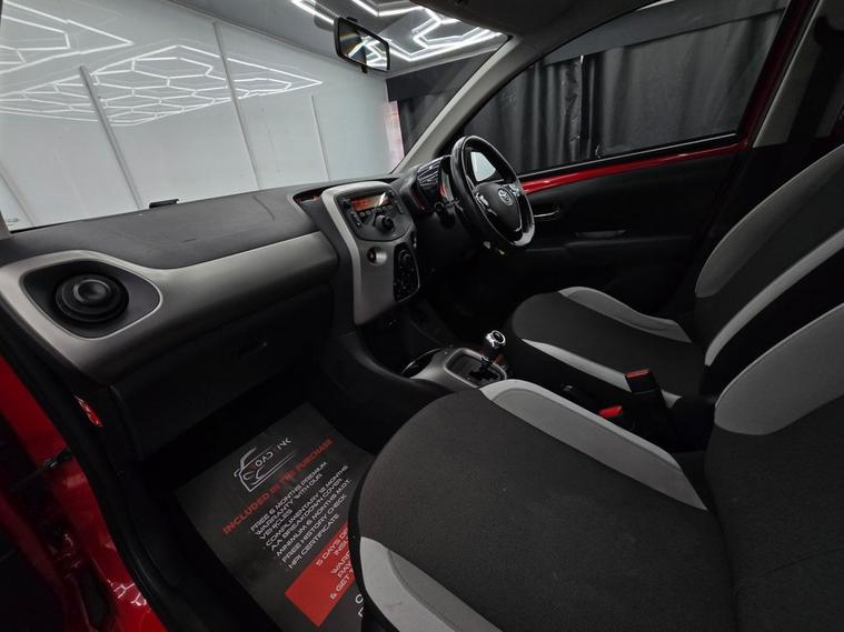 TOYOTA AYGO X-PLAY SMART, RELIABLE & BUILT FOR CITY LIFE This TOYOTA AYGO X-PLAY is the ideal compact car economical, easy to park, and stylish inside and out. With its BODY-COLOURED MIRRORS AND DOOR HANDLES, LED DAYTIME RUNNING LIGHTS, and INTEGRATED REAR SPOILER, it looks sharp on any road. Inside, you'll find BLUETOOTH CONNECTIVITY, USB INPUT, and STEERING WHEEL AUDIO CONTROLS, so your music and calls are always at your fingertips. The cabin is both comfortable and practical, with a LEATHER STEERING WHEEL, LEATHER GEAR SHIFT, and AIR CONDITIONING for a pleasant drive in any weather. Other highlights include ELECTRIC FRONT WINDOWS, HEATED DOOR MIRRORS, REVERSING CAMERA, and SPLIT-FOLDING REAR SEATS for added flexibility. Perfect for new drivers or anyone looking for low running costs without missing out on quality. Reliable, fuel-efficient, and ready to go!