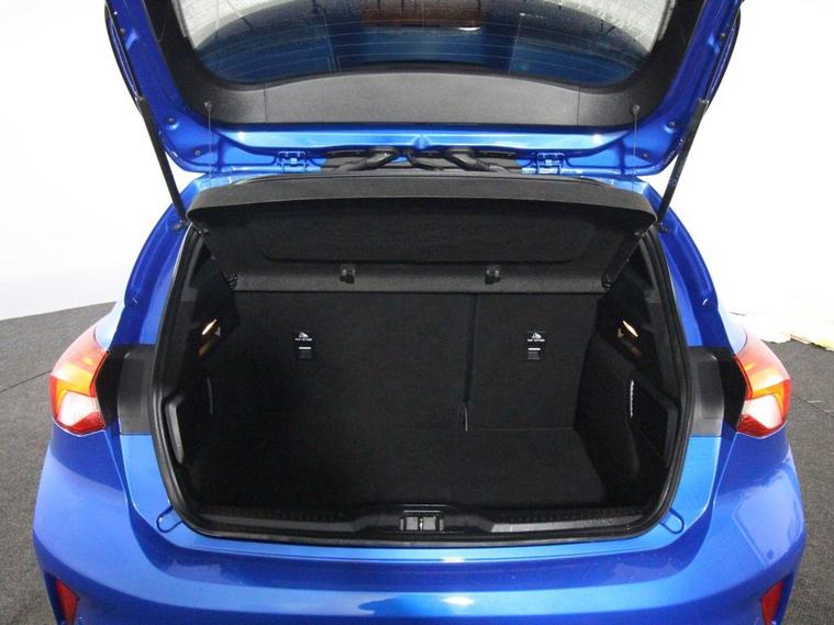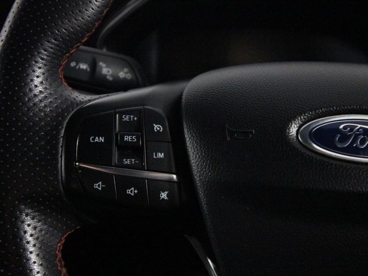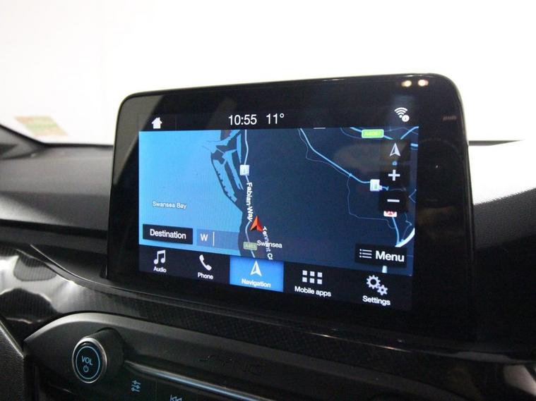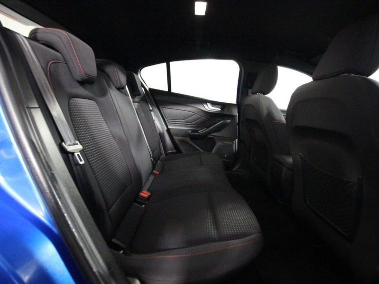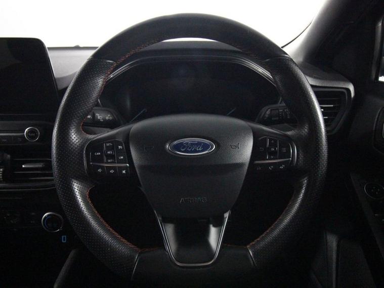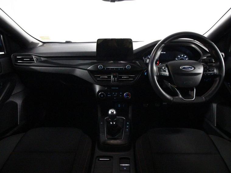 Last serviced at 46, 112 miles. This 2019 Ford Focus 1.0T EcoBoost ST-Line is a sporty and stylish hatchback equipped with a 125ps Euro 6 petrol engine and manual transmission. It rides on 17-inch 5x2-spoke alloy wheels in Rock Metallic and features distinctive ST-Line body styling including a unique upper and lower grille, wing badges, large body-coloured rear spoiler, and polished twin tailpipes. The exterior also includes LED daytime running lights, halogen reflector headlights with automatic on/off, LED front fog lights with cornering functionality, heated electric door mirrors with integrated indicators, and a Quickclear heated windscreen. Inside, the Focus ST-Line offers manual air conditioning, a leather-trimmed flat-bottomed steering wheel with red stitching, and a spacious centre console with armrest. The infotainment system uses Ford SYNC with an 8-inch TFT touchscreen, while MyKey allows customizable driver settings. Comfort features include drivers manual lumbar seat adjustment, front and rear electric windows with one-touch control, and auto-folding rear seats. Safety technologies are advanced with front, side, and rear curtain airbags, lane keeping aid and lane departure warning, pre-collision assist systems with autonomous emergency braking including pedestrian and cyclist detection, post-collision braking, electronic stability control, and tyre pressure monitoring. The car is protected by a Thatcham Category 1 alarm and immobiliser, with remote central locking for convenience.
