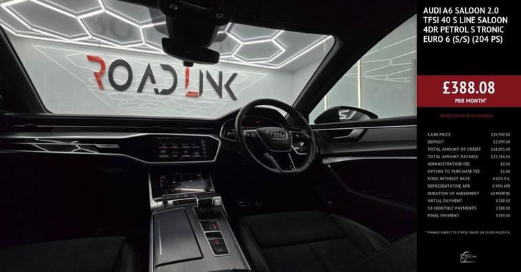 Experience executive comfort and sporty design with this Audi A6 Saloon S line, featuring 19 5 twin-spoke alloy wheels and striking S line styling. Inside, enjoy heated front sports seats, electric memory function, black headlining, and ambient LED lighting for a premium cabin feel. Stay connected with the Technology Pack, including Audi Smartphone Interface, MMI Navigation, and Amazon Alexa integration. Drive with confidence thanks to Matrix LED headlights, Lane Departure Warning, Pre-Sense Front, and a rear-view camera. The car also includes Parking System Plus, Cruise Control, and progressive steering for effortless handling. Dual-zone climate control and keyless go add everyday convenience. A split-folding rear seat and electric boot lid make it as practical as it is stylish. Safety is covered with multiple airbags, tyre pressure monitoring, and advanced pedestrian protection. This A6 blends Audis signature performance, comfort, and innovation into a truly refined saloon.