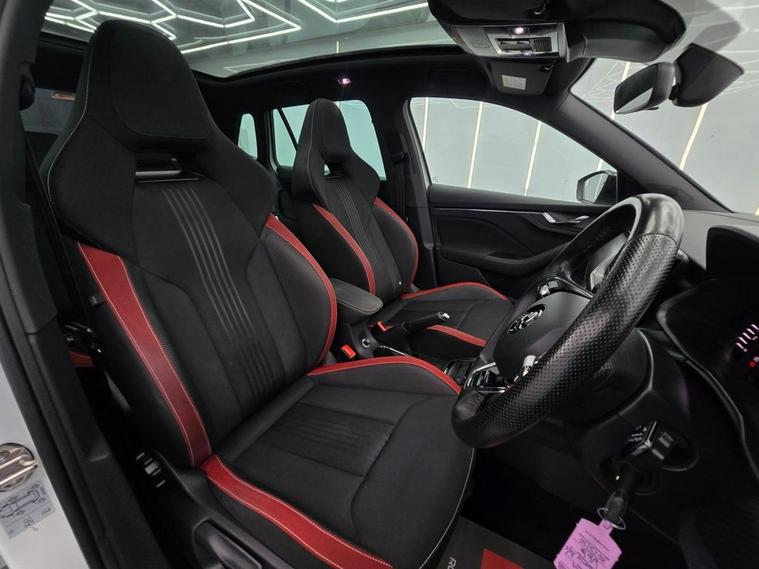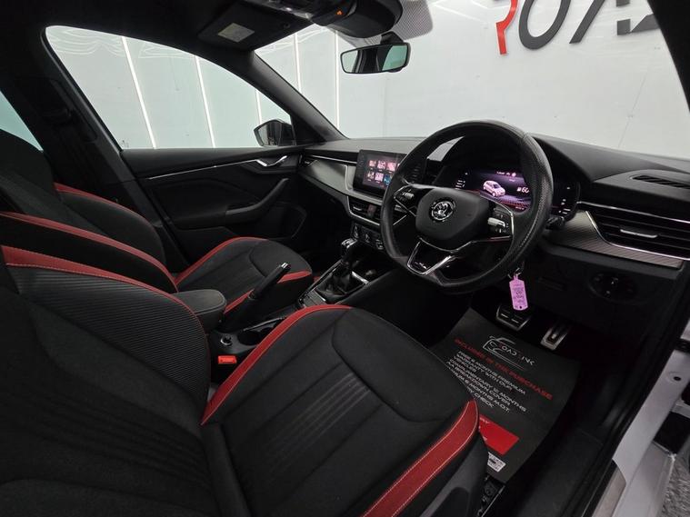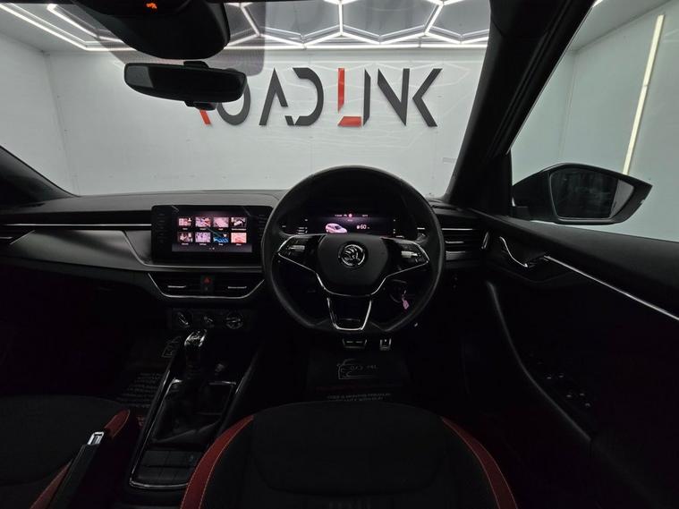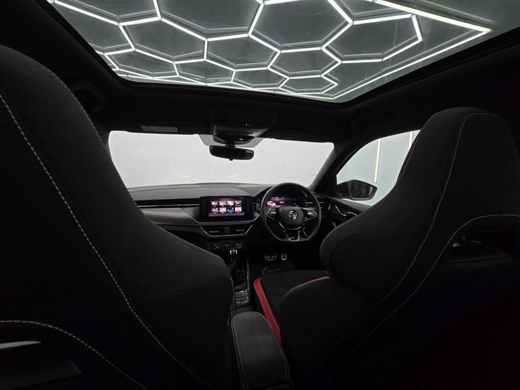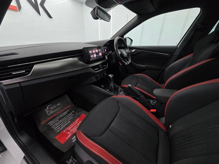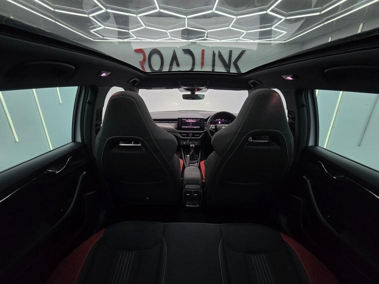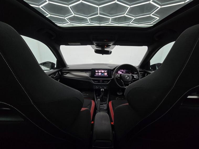 This koda Kamiq Monte Carlo combines SUV practicality with sporty Monte Carlo styling and a host of premium features. Finished with 18 Vega Black alloy wheels, gloss black roof rails, panoramic sunroof, privacy glass, and sports bumpers, it has a bold, dynamic look. Inside, the cabin features black roof lining, ambient lighting, carbon-effect inserts, and a Monte Carlo plaque, giving it a refined and sporty atmosphere. The Amundsen satellite navigation system with 9.2 touchscreen, Virtual Cockpit digital display, wireless SmartLink, Bluetooth, voice control, gesture control, and DAB radio keep you connected and entertained on every drive. Comfort and convenience are covered with manual air conditioning, height-adjustable front seats with lumbar support, front centre armrest, rear parking sensors, cruise control, and panoramic glass roof. Safety is a top priority with Front Assist, Lane Assist, Traffic Sign Recognition, ISOFIX points front & rear, side & curtain airbags, and tyre pressure monitoring system.