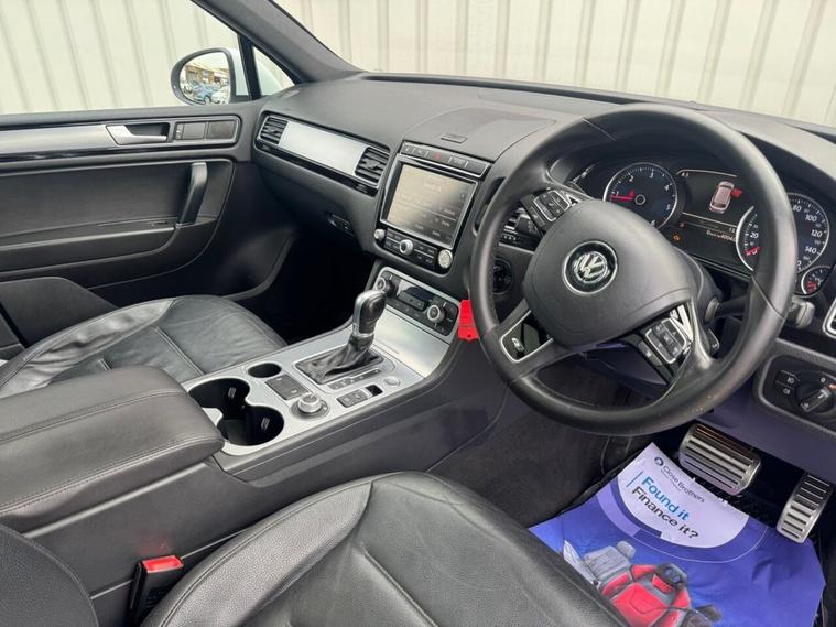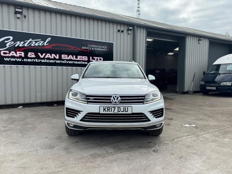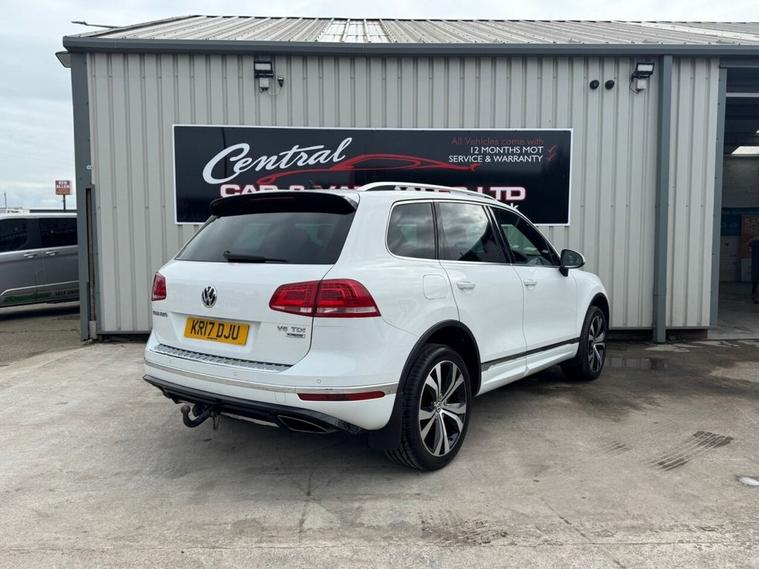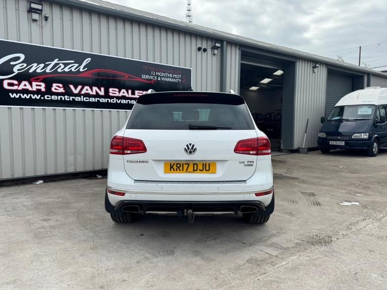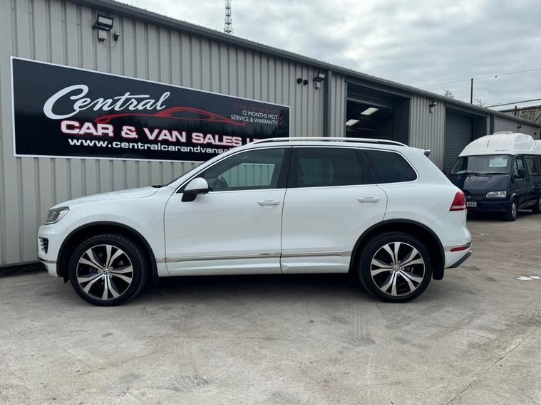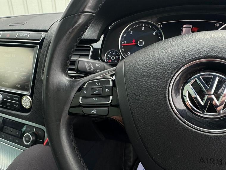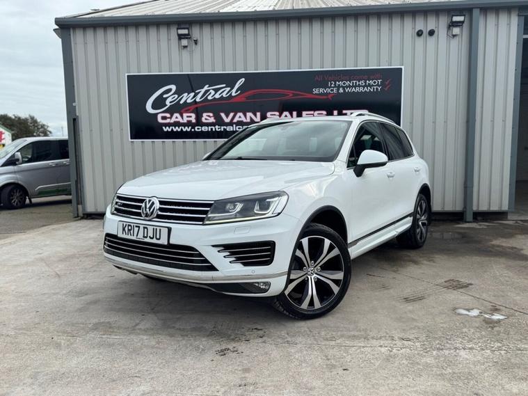 May 2017 Volkswagen Touareg 3.0 TDI V6 TDI finished in Onyx White. The car has done 73, 696 miles from new and comes with extensive service history, The car is Euro 6 so conforms to the ULEZ requirements meaning no congestion charges! as the car is safe for the environment! The car produces 201BHP and has a 8 speed automatic transmission with paddle shifts. Road tax costs just £195 for 12 months and it is insurance4 group 40E The car returns 36mpg urban, 46mpg extra urban and 43mpg combined top speed of 130 MPH 0-60MPH in 8.7 seconds CO2 OUTPUT OF 176 G/KM. The car has 20 black/chrome alloy wheels, multi function steering wheel, x4 electric windows, heated electric door mirrors with power fold, heated steering wheel multiple airbags, 8 speed auto, start/stop, traction control, cup holders, climate control, air conditioning, heated seats, cruise control, electronic parking brake, auto hold, glovebox and dash box, storage under centre armrest, rear armrest, auto lights, paddle shifts, pan roof, ISOFIX car seat jacking points, piano black dashboard trims, keyless entry, keyless go.