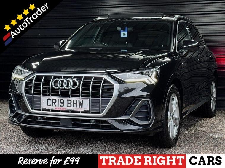 JUST ARRIVED & READY TO DRIVE AWAY! 2019/19 Audi Q3 1.5 TFSi CoD 35 S-Line [Pan Roof] S-Tronic finished in Mythos Black. We are pleased to offer this lovely 5 door petrol SUV. This is the highly desirable and economical 1.5 litre model with a 7 speed automatic [S-Tronic] transmission that offers 148 BHP. It has covered just 55, 491 miles with service history (5 services, 4 @ Audi) and drives as you would expect. Just serviced upon arrival. MOT until 30th September 2026 with no advisories. The car is ready to drive away. We will also include a complimentary 12 month AA breakdown cover. Two owners from new, the last owner has had the car since 2022. Euro 6 status - ULEZ compliant. A superb low mileage example with the sought-after and upgraded S-Line specification. Key features include; sliding panoramic roof, heated seats, A/C, DAB, 10.25 virtual cockpit, 19 Dynamic alloy wheels, privacy glass, MMi navigation plus with 10.1 high definition display, LED DRLs, cruise control with speed limiter, ambient lighting and rear parking sensors. Advertised below the AutoTrader RRP. Please let us know if you would like any further information or a video sent via WhatsApp. Please be aware many of our cars sell before the photos go live so please call or reserve to avoid any disappointment.