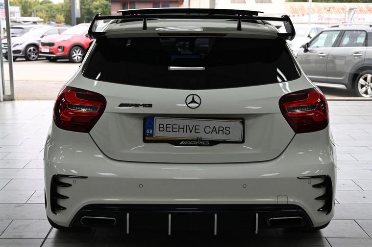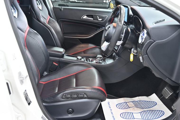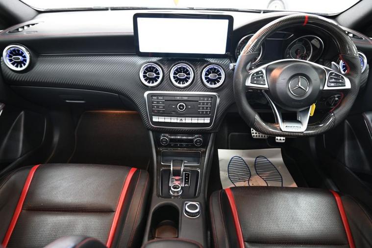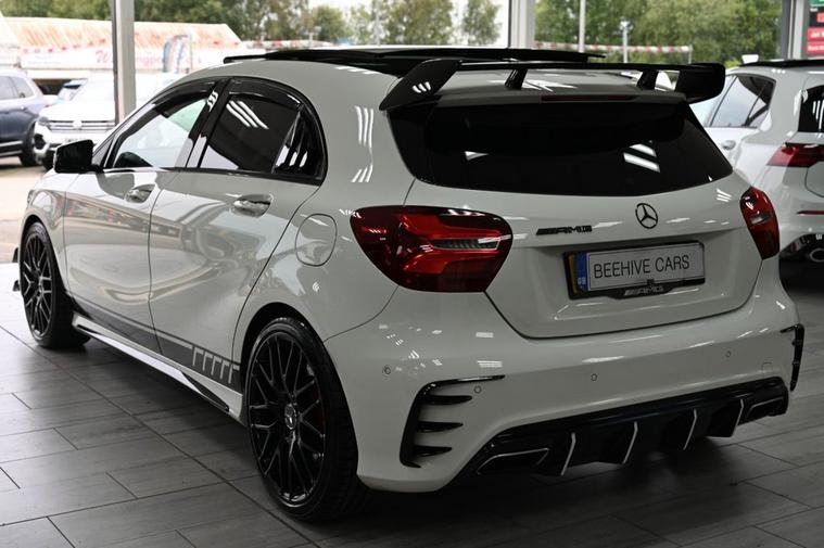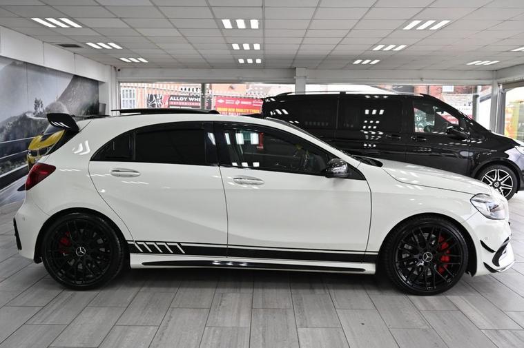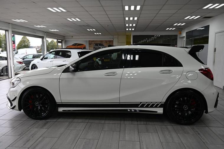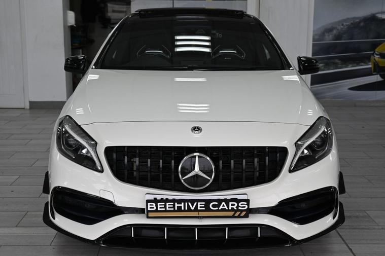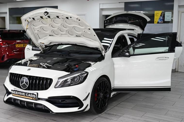 DRIVE AWAY TODAY OR HOME DELIVERY TO YOUR DOORSTEP FINANCE & PART EXCHANGE ARRANGED ONLINE** 7 DAY MONEY BACK GUARANTEE** Lovely Mercedes A-Class A45 amg dct 4matic in metallic cirros white amg night and exclusive package with service history sat nav cd dab radio bluetooth media usb harman kardon logic 7 surround sound system panoramic glass roof full amg exclusive perforated black and red leather seats with leather armrest heated seats electric memory seats electric folding door mirrors front and rear parking aid sensors xenon lights flat bottom amg steering wheel with f1 style paddleshifts comfort sport individual dynamic driving mode amg performance exhaust amg aerodynamic bodystyling package alloys privacy PRIVE PLATE INCLUDED XX67 AMG