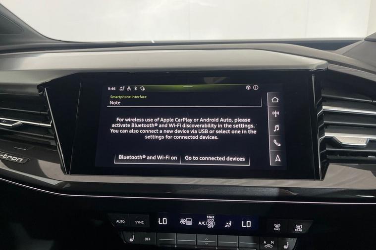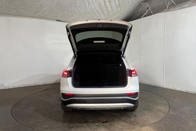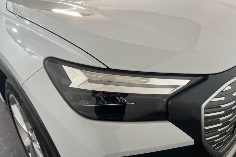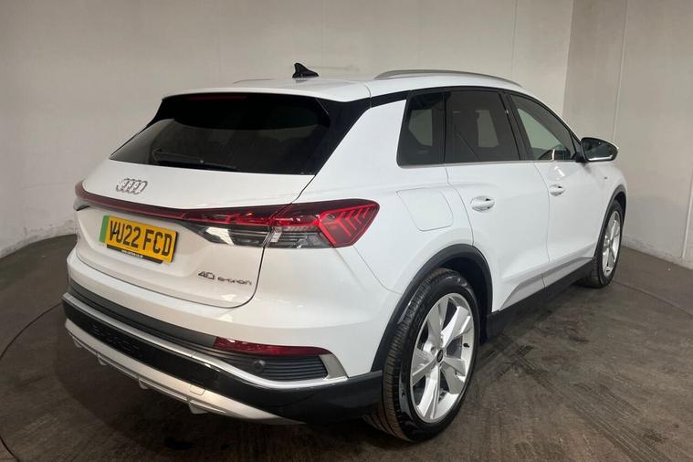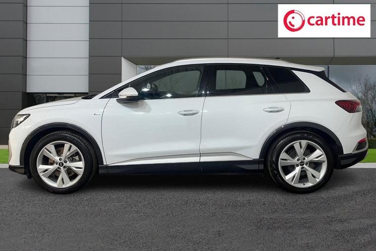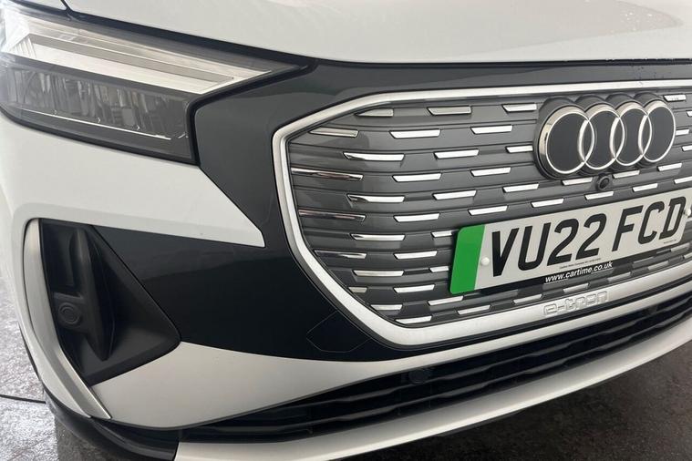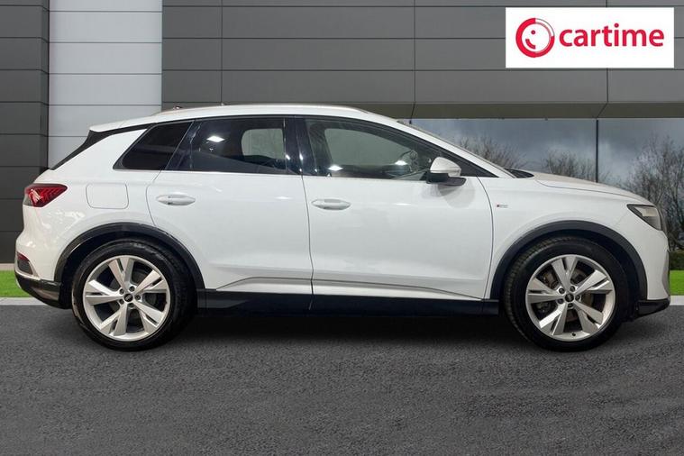 Only launched last year, this fantastic Q4 e-tron has a Glacier White paint finish with 20-inch silver alloy wheels, privacy glass, twin exhaust and gloss black and brushed silver aluminium trim around the car. The car has immaculate half leather and Alcantara S Line black seats with gloss black / brushed silver trim around the cabin. There is also a leather-trimmed multi-function steering wheel and heated front seats. Being a high specification, this Audi has lots of kit including a 10.25-inch touchscreen multimedia screen with Satellite Navigation system, a 12.3in Virtual Cockpit Display, DAB digital radio and compatibility for Bluetooth and USB devices as well as Apple CarPlay and Android Auto. Additionally there are front / rear parking sensors, a reverse camera, automatic LED lights, automatic rain-sensing windscreen wipers, heated electric power-folding door mirrors, electric tailgate, cruise control with speed limiter, three-zone climate control and Stop/Start engine system.